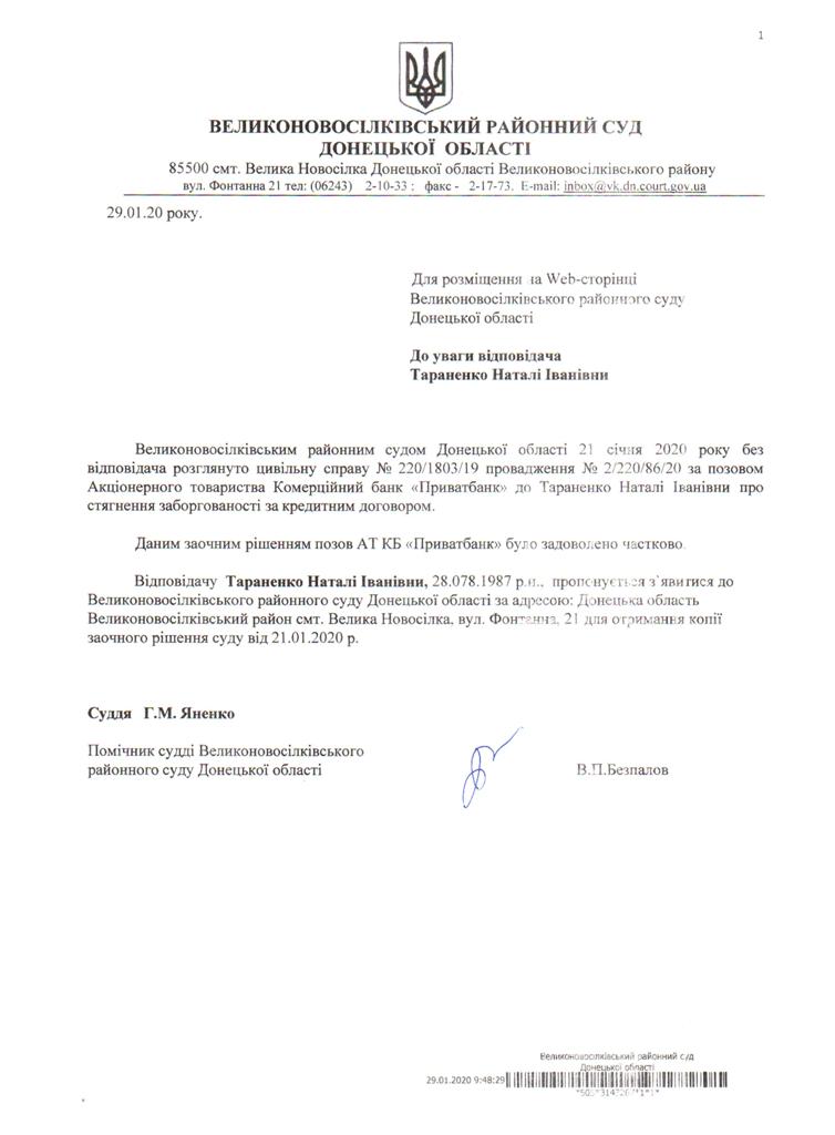 оголошення для Тараненко Н.І. щодо отримання копії заочного рішення