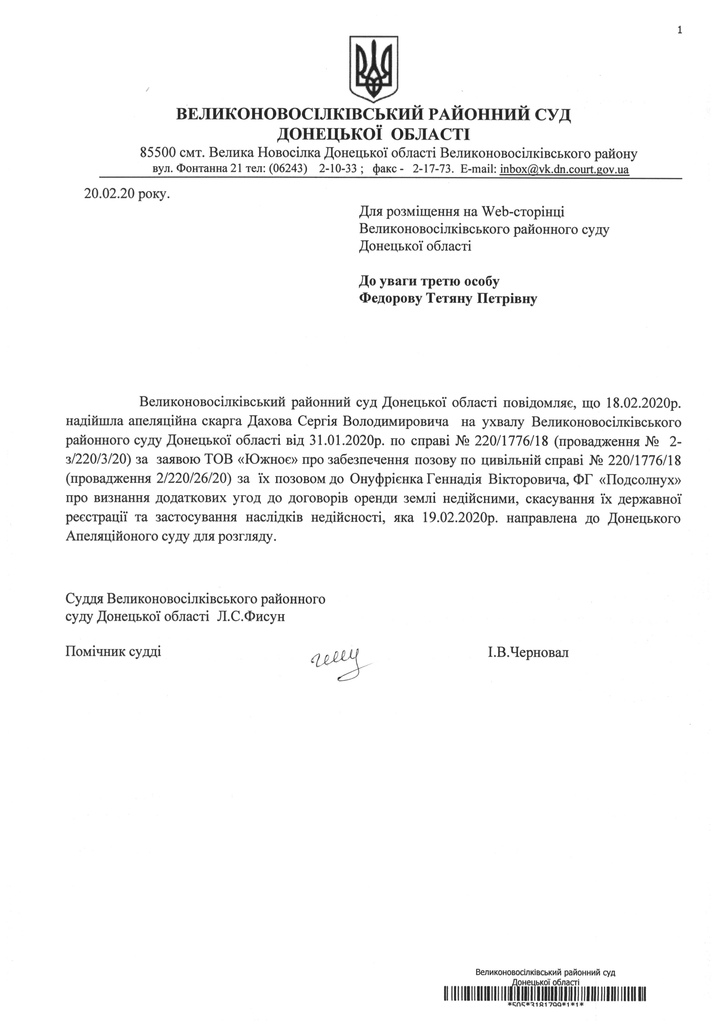 До уваги третю особу Федорову Тетяну Петрівну