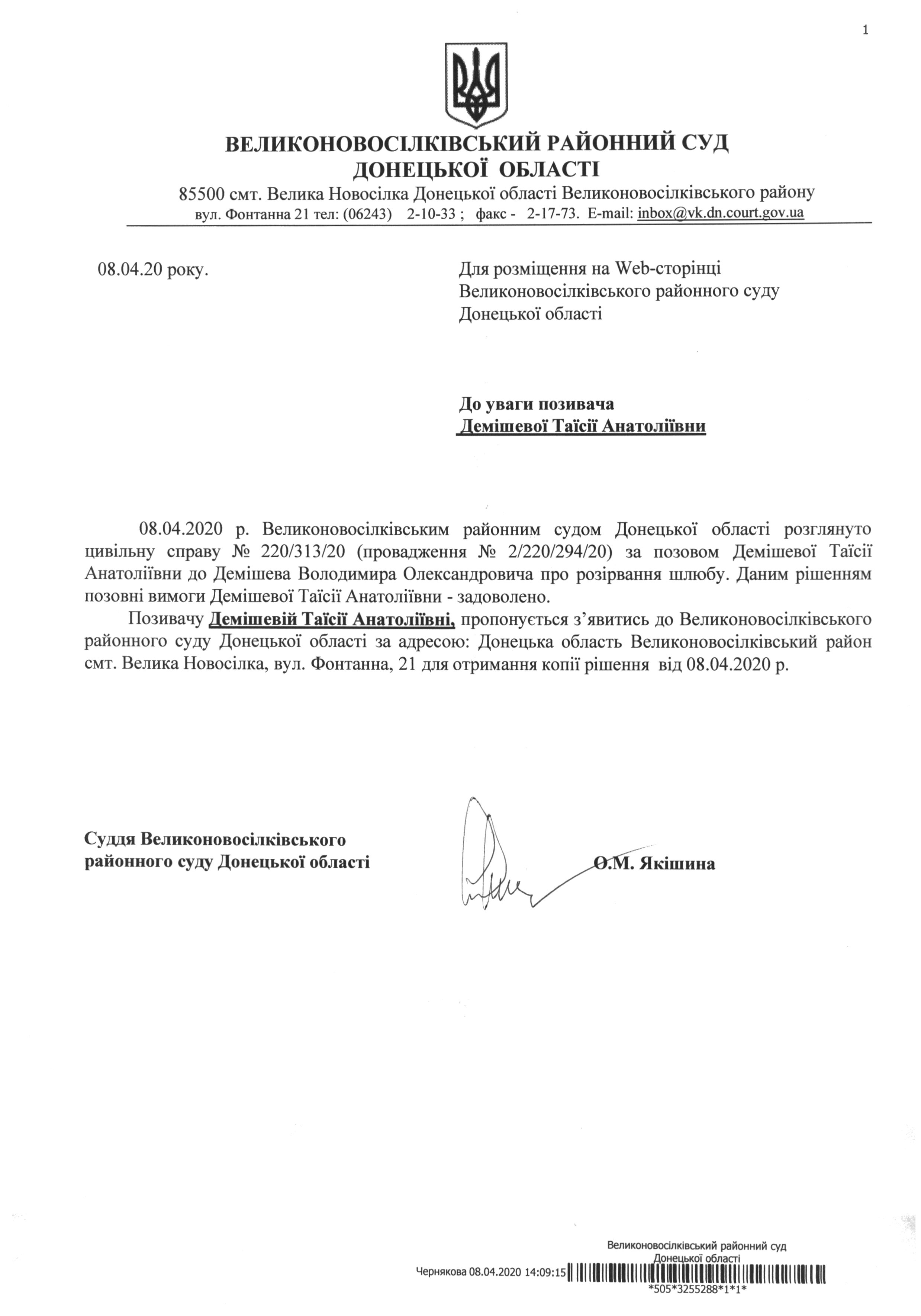 До уваги відповідача Демішевої Таїсії Анатоліївни