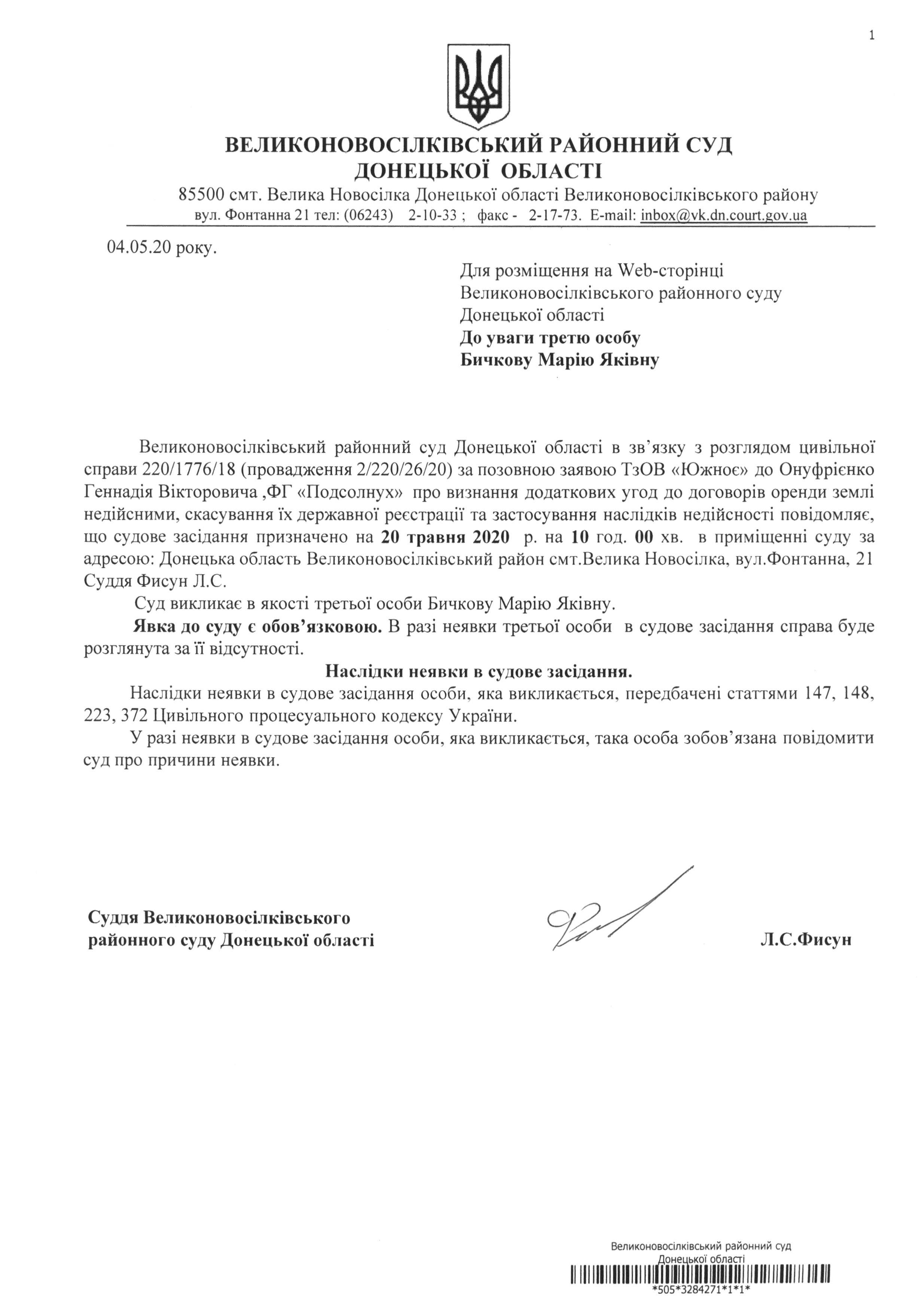 До уваги третю особу Бичкову Марію Яківну
