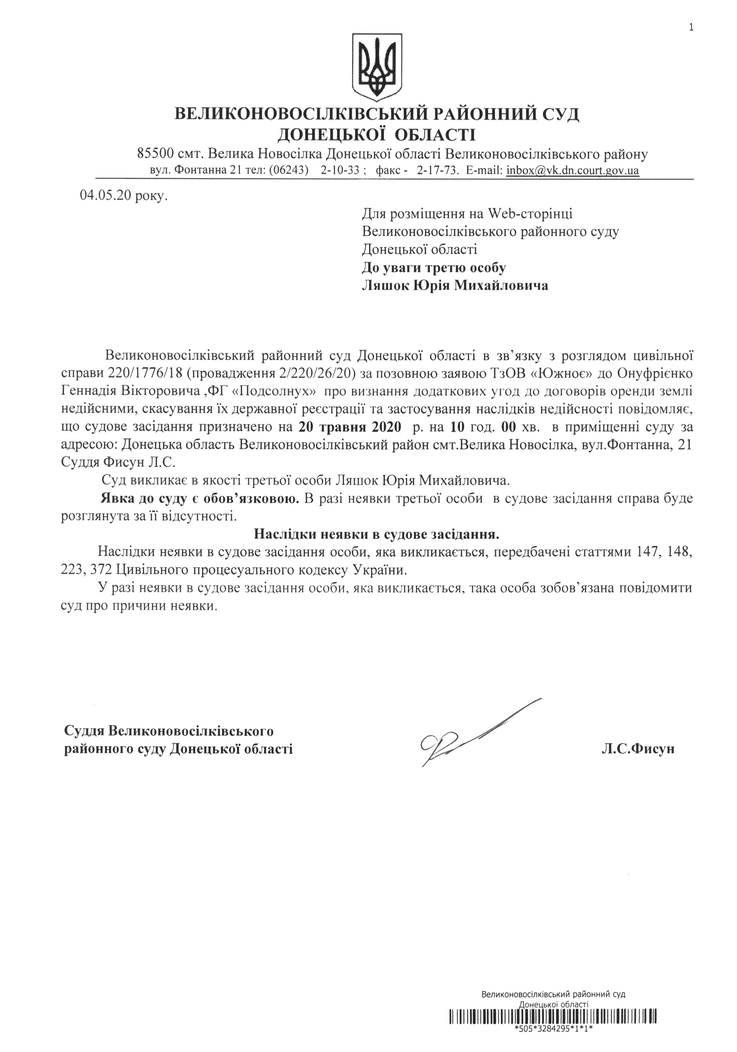 До уваги третю особу Лешок Юрія Михайловича