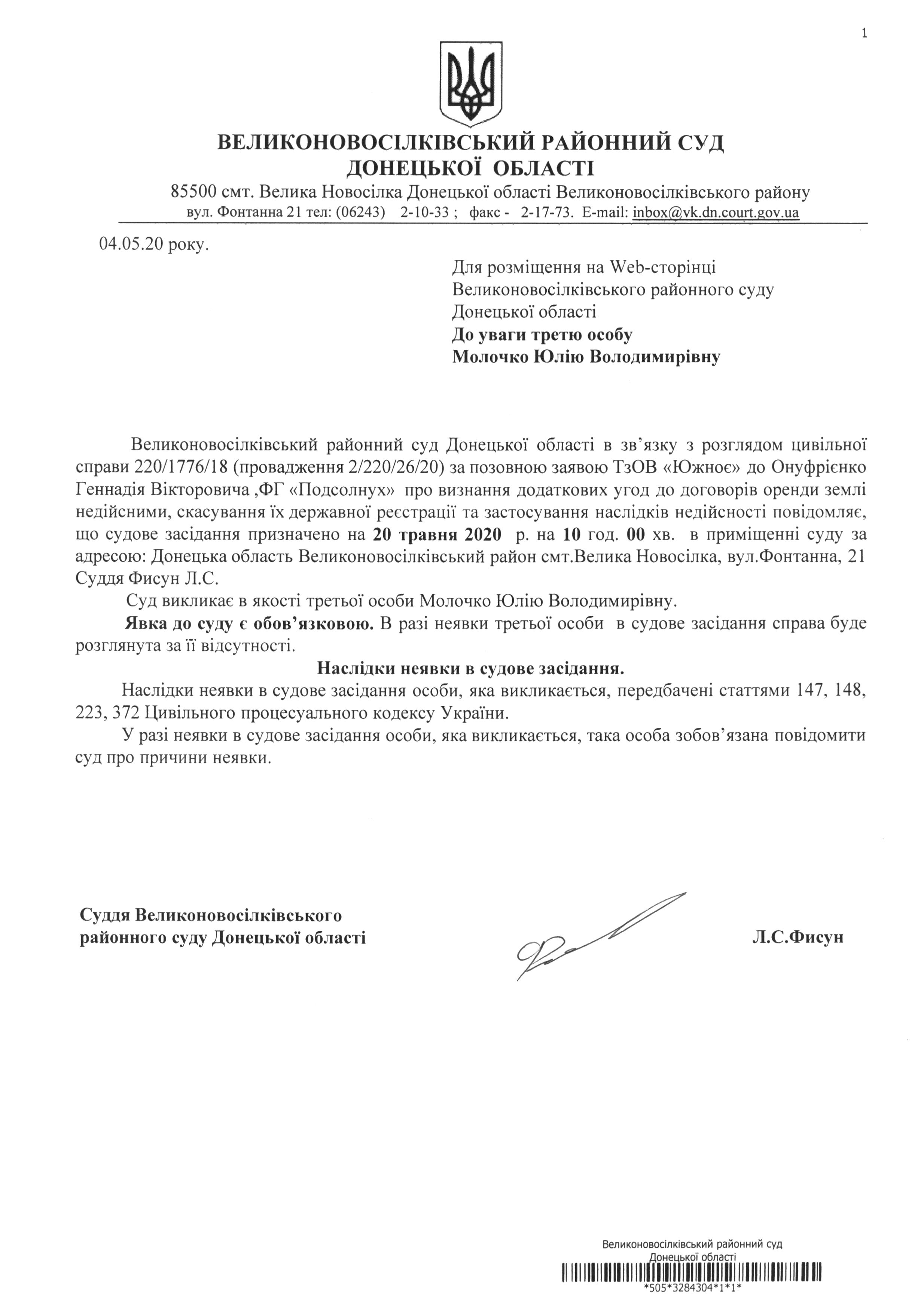 До уваги третю особу Молочко Юлію Володимирівну