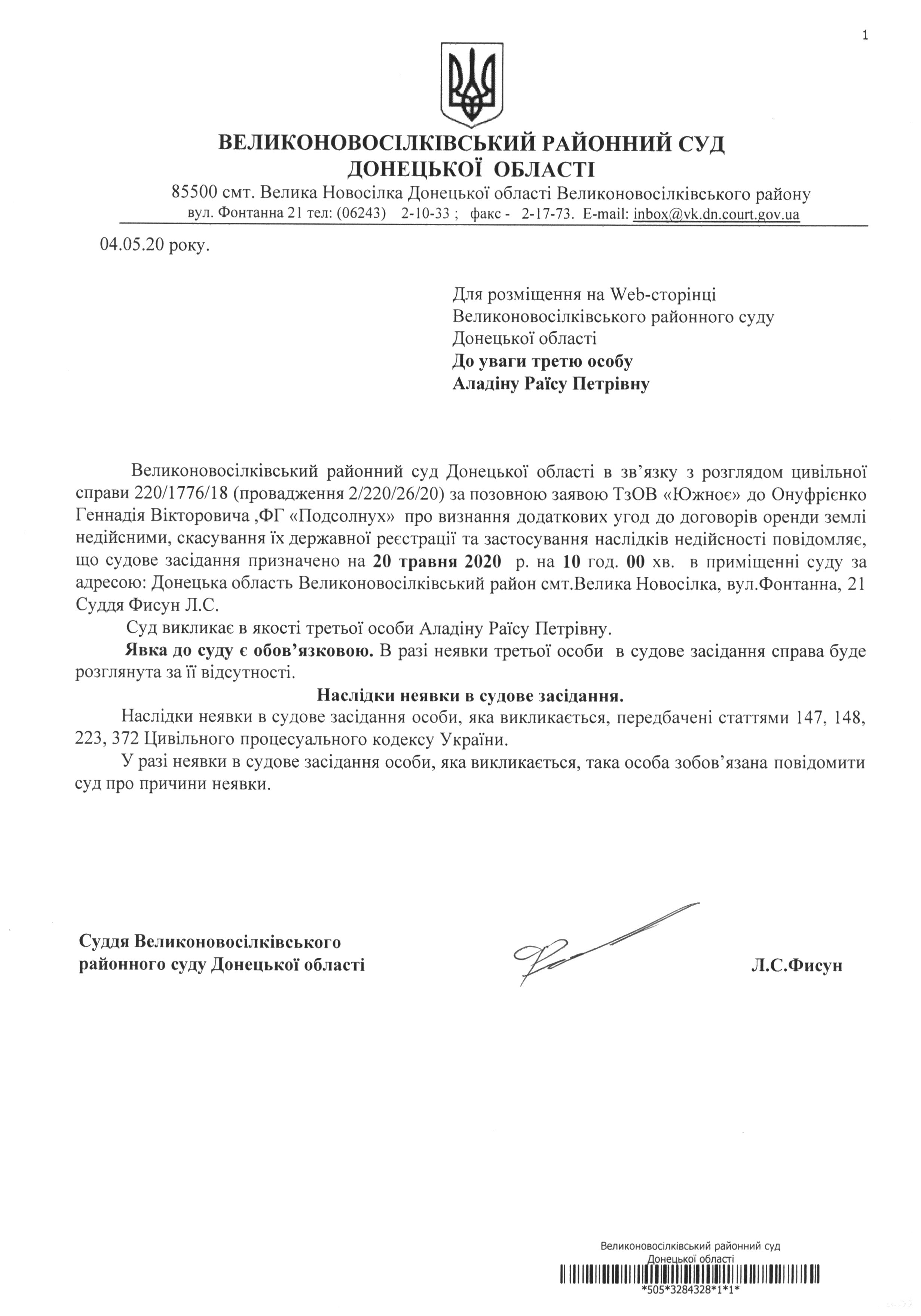 До уваги третю особу Аладіну Раїсу Петрівну