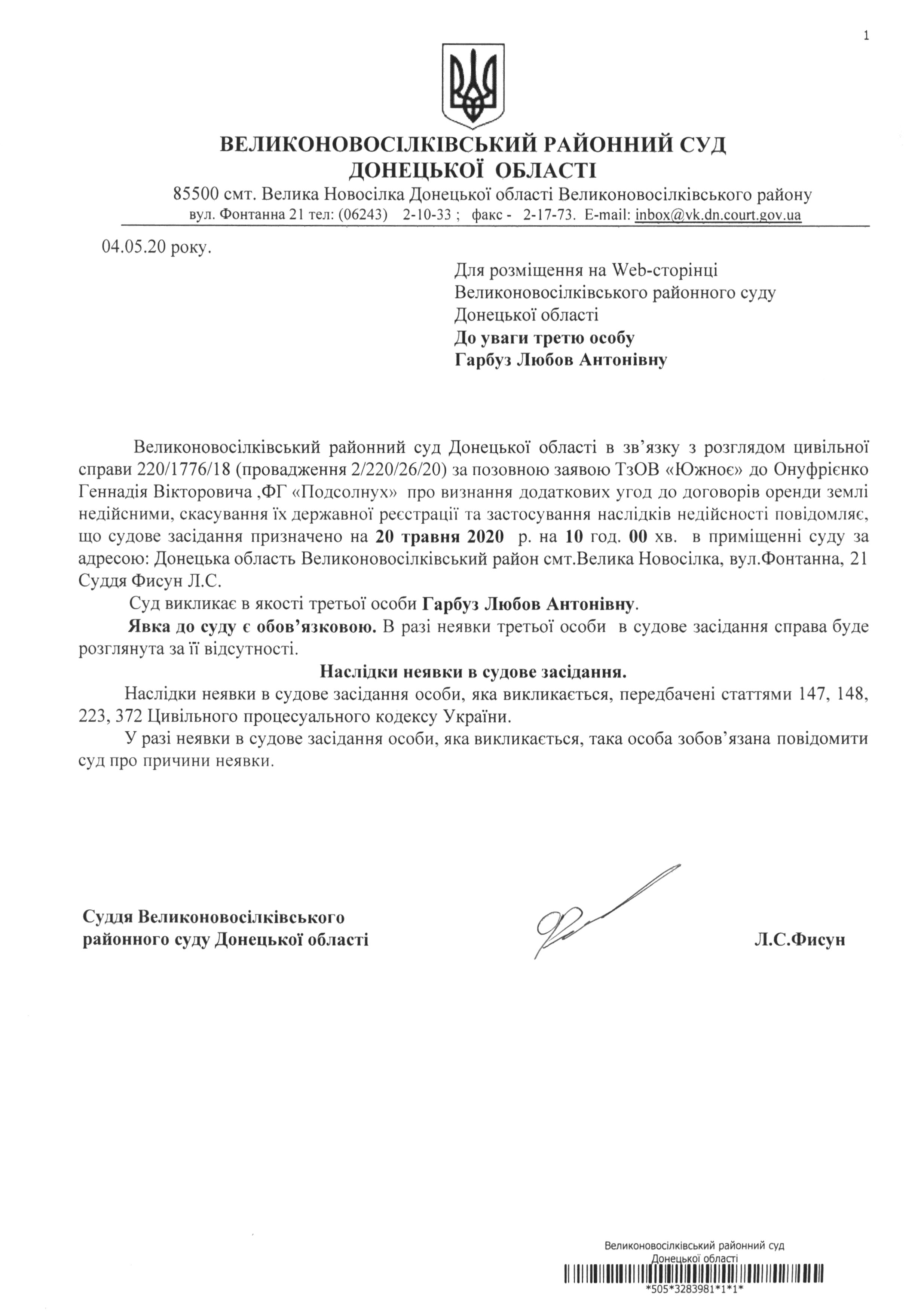 До уваги третю особу Гарбуз Любов Антонівну