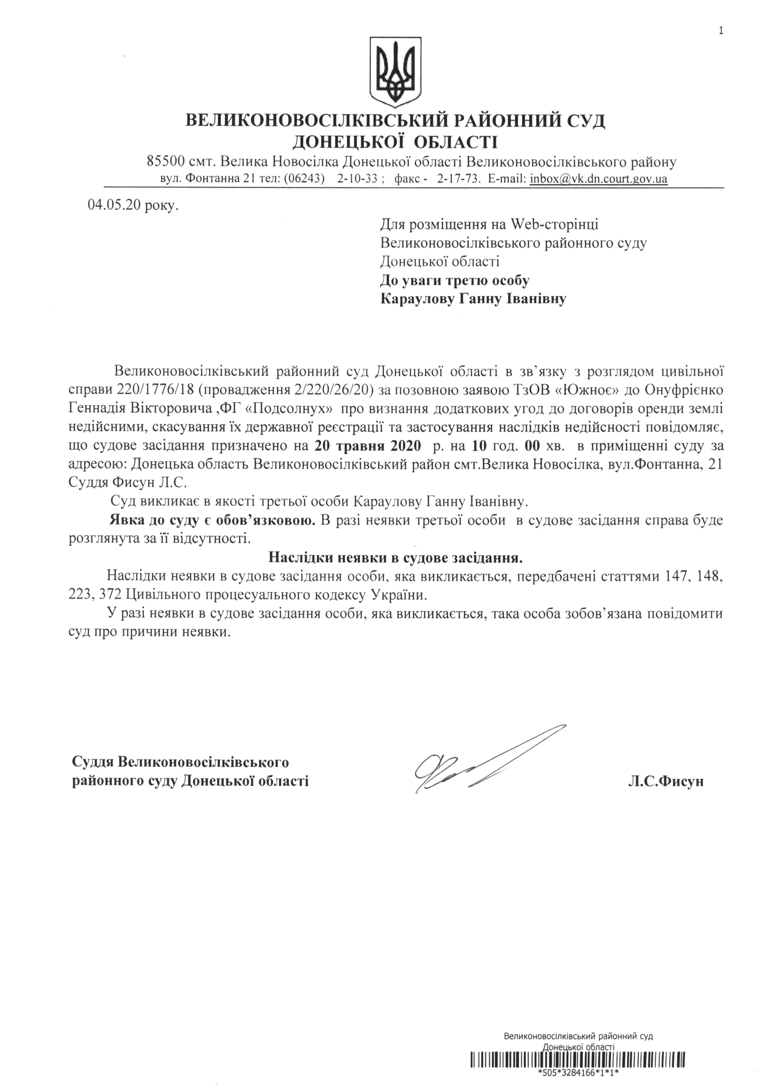 До уваги третю особу Караулову Ганну Іванівну