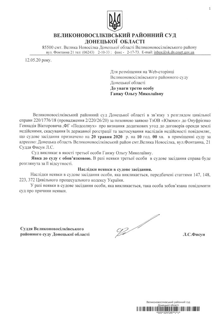 До уваги третю особу Ганжу Ольгу Миколаївну