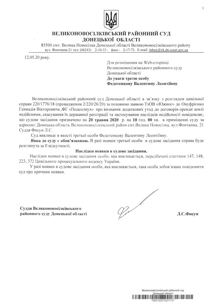До уваги третю особу Федотенкову Валентину Леонітіївну