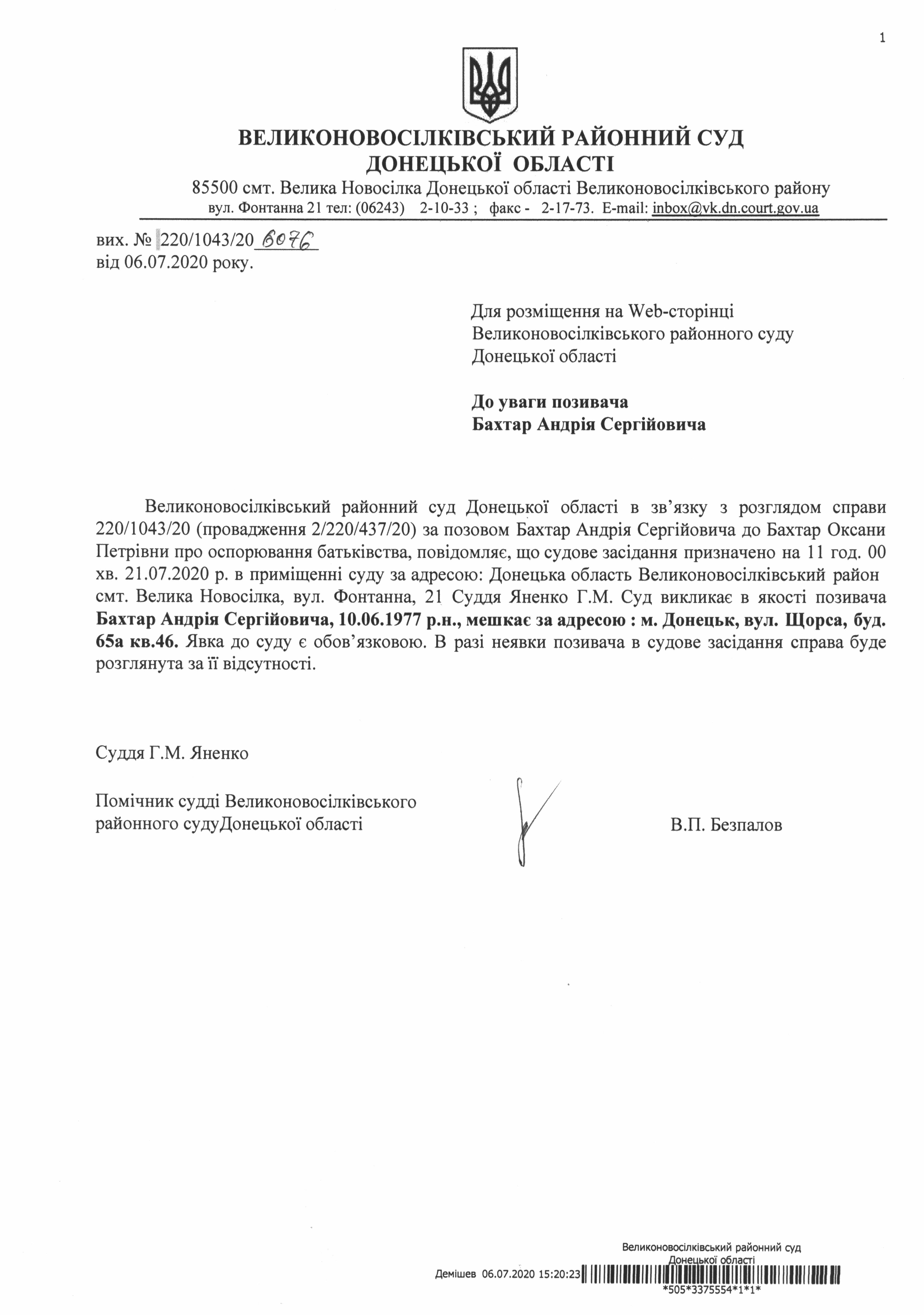 До уваги позивача Бахтар Андрія Сергійовича