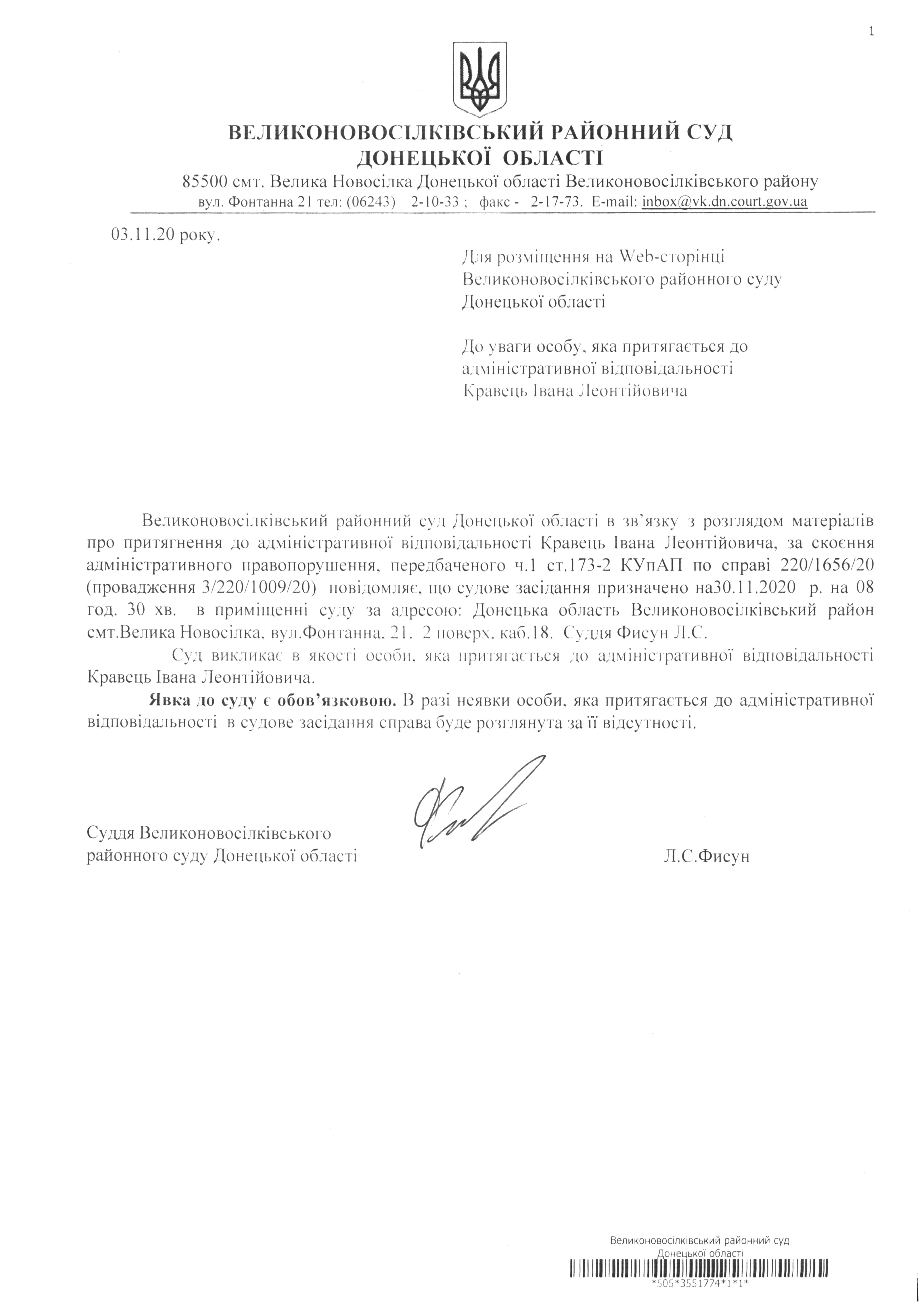 До уваги особу, яка притягається до адміністративної відповідальності Кравець Івана Леонтійовича