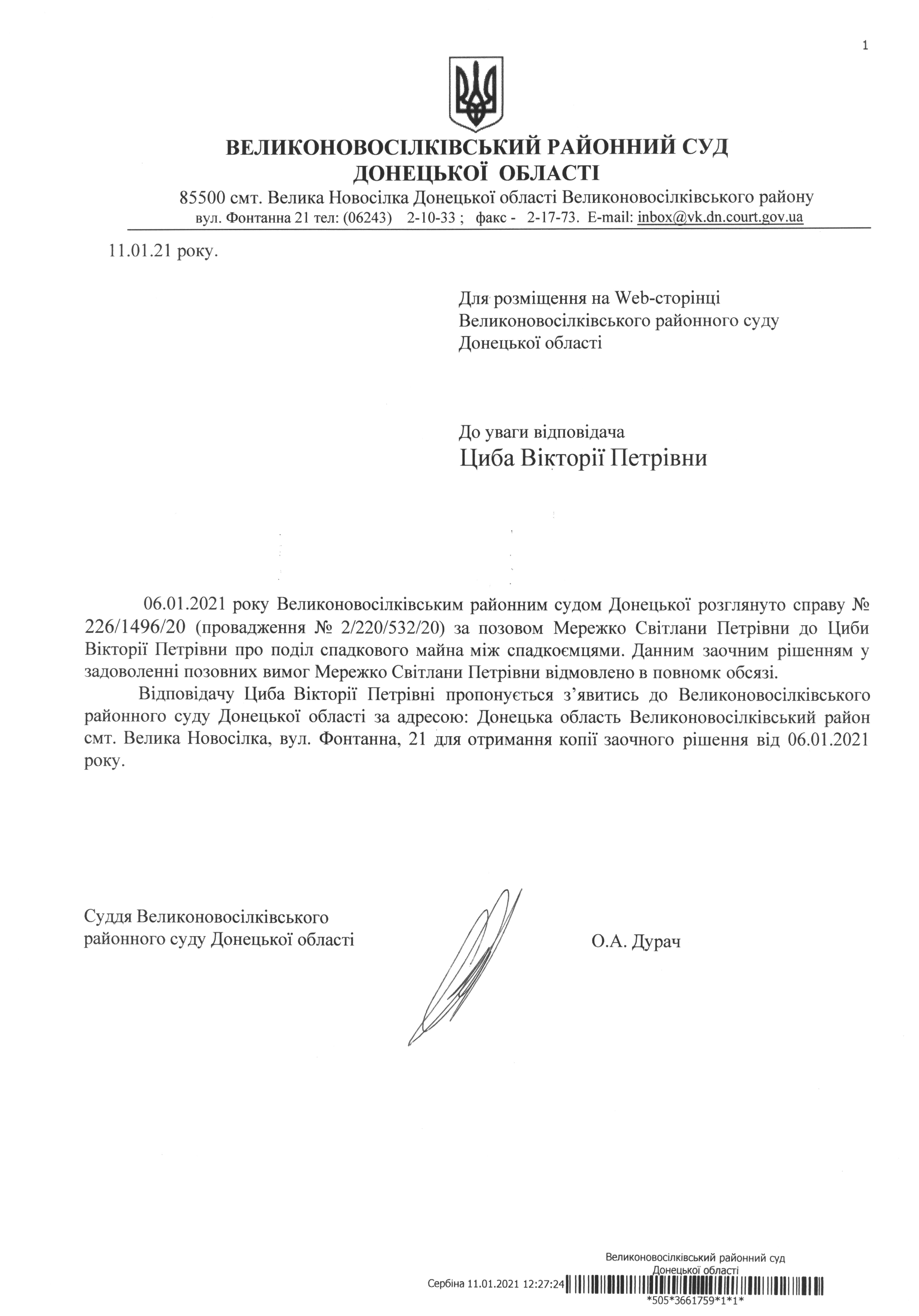 До уваги відповідача Циба Вікторії Петрівни