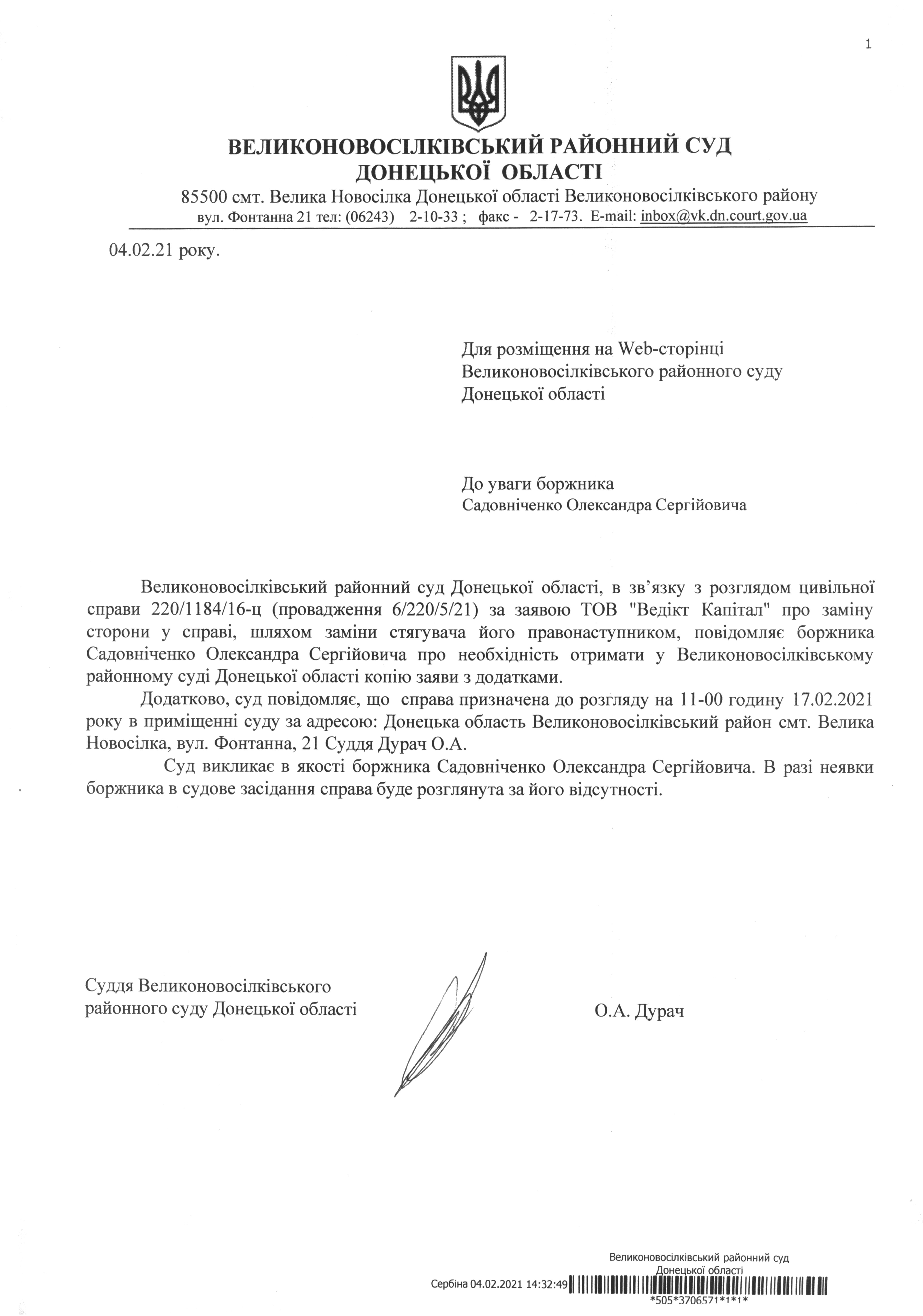 До уваги боржника Садовніченко Олександра Сергійовича