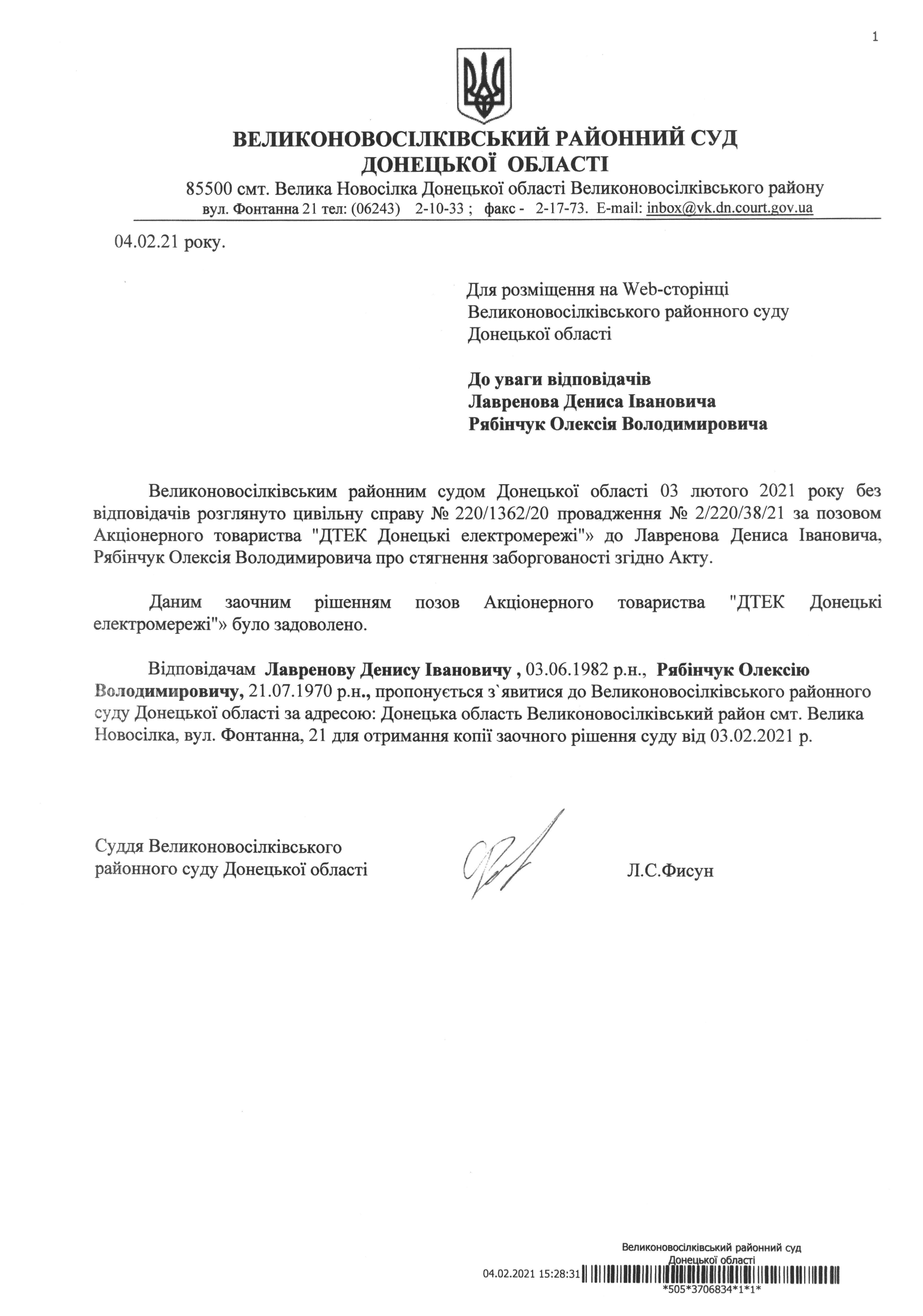 До уваги відповідачів Лавренова Дениса Івановича Рябінчук Олексія Володимировича