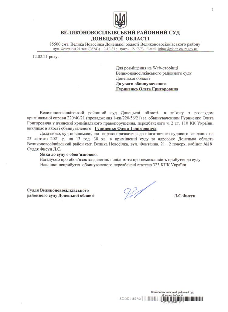 оголошення про виклик до суду Гуриненка О. Г.