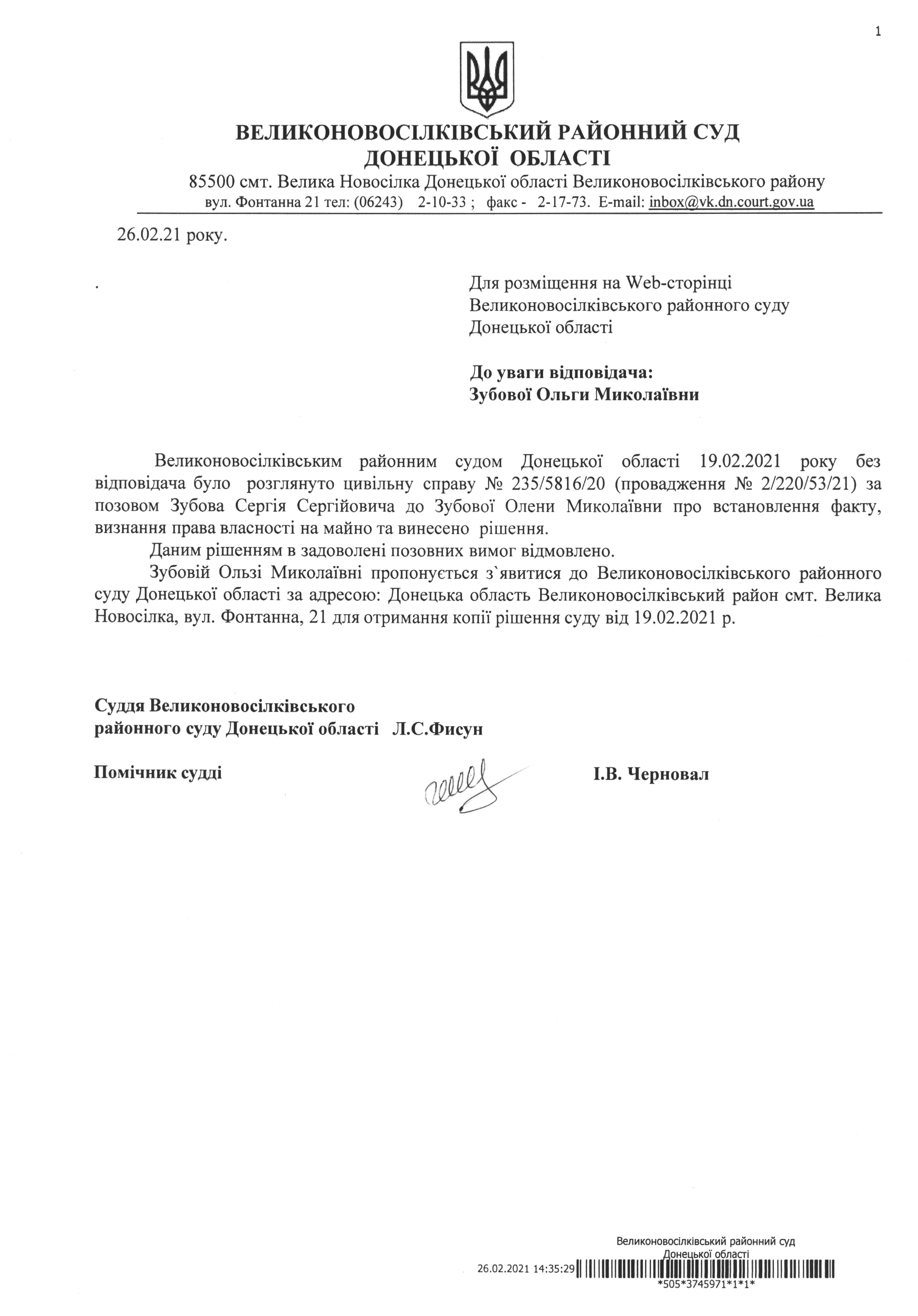 До уваги відповідача Зубової Ольги Миколаївни