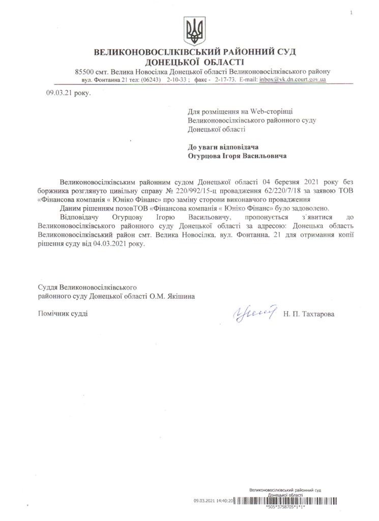 оголошення для Огурцова І.В. щодо отримання копії ухвали