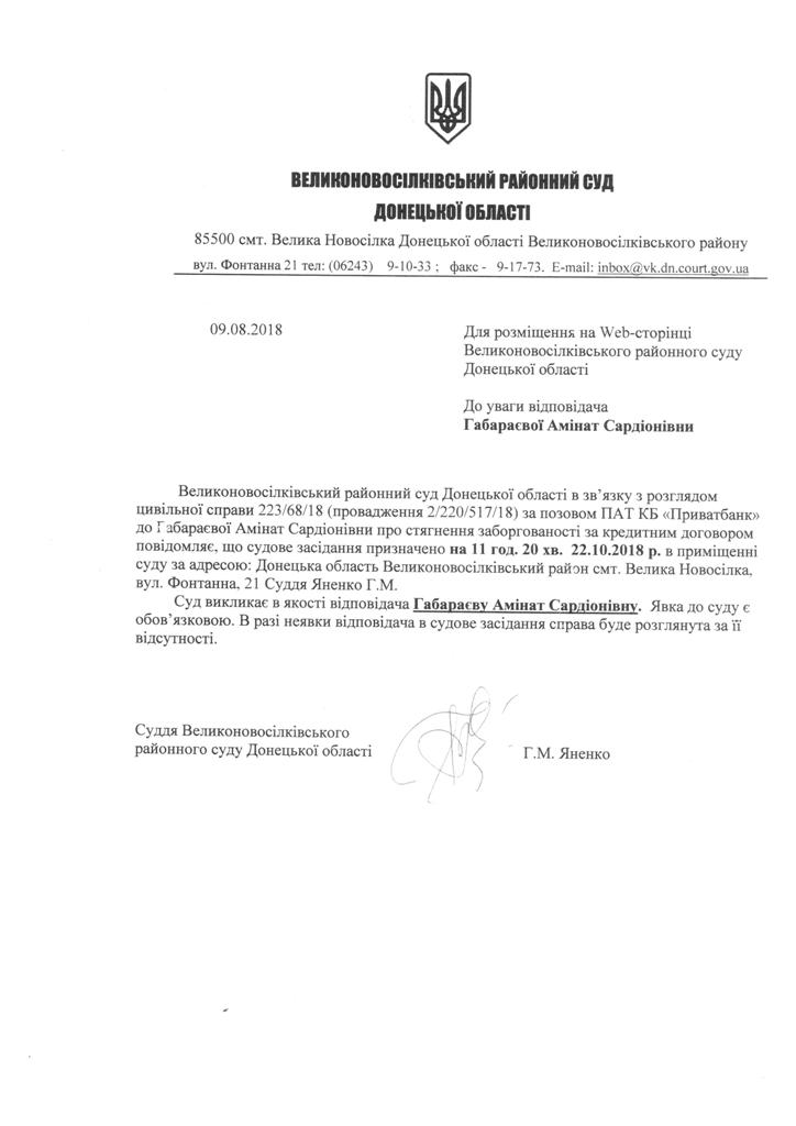 Оголошення про виклик до суду Габараєвої А.С.