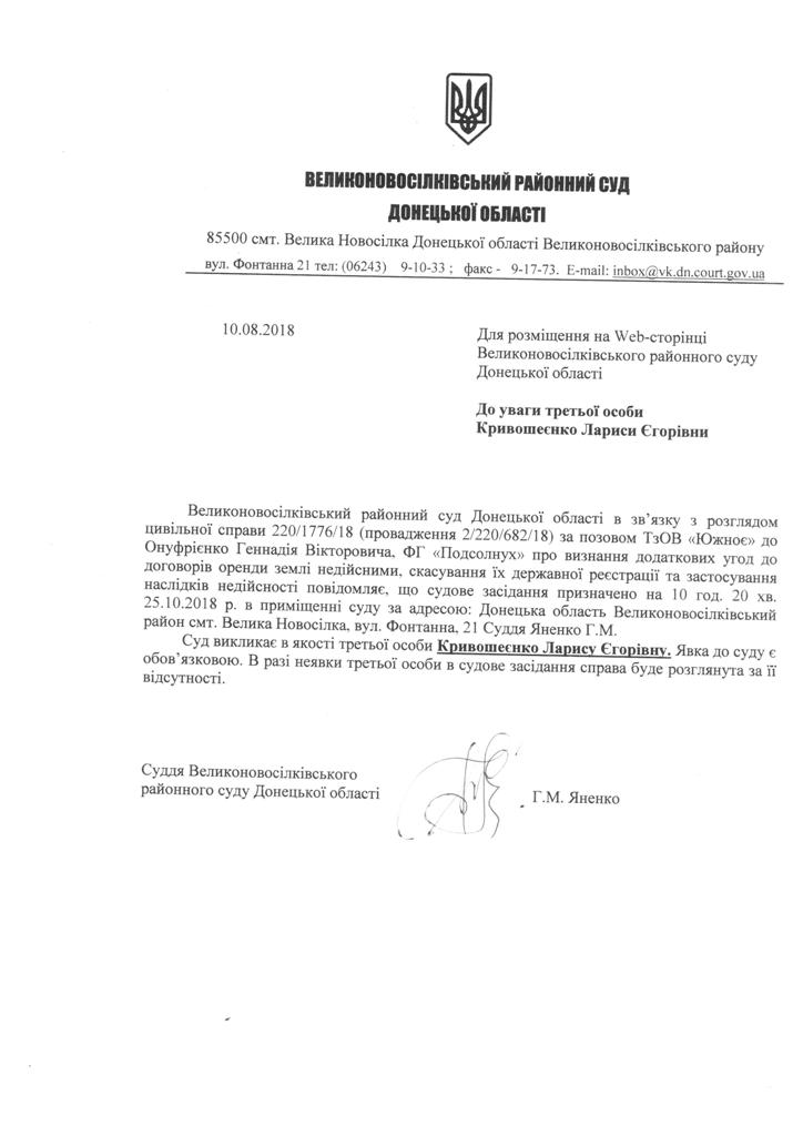 Оголошення про виклик до суду Кривошеєнко Л.Є.