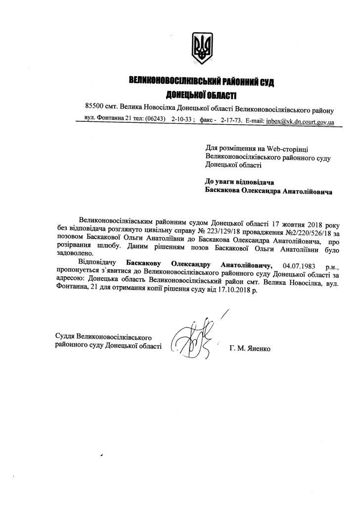 Оголошення для Баскакова О.А. щодо отримання копії рішення