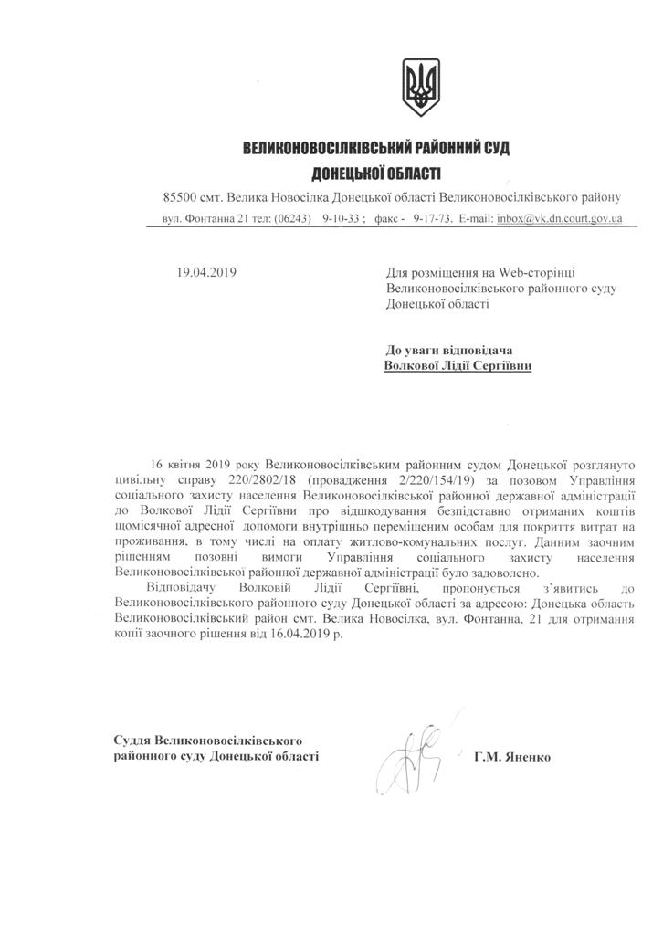 Оголошення для Волкової Л.С. щодо отримання копії заочного рішення