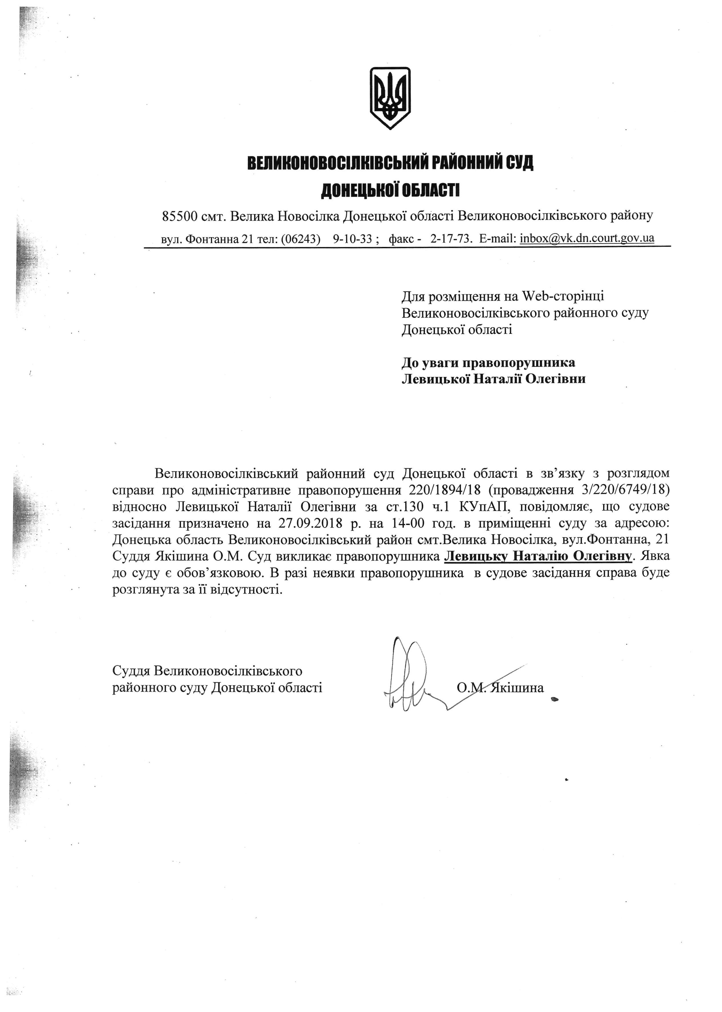 Оголошення про виклик до суду Левицьку Н.О.