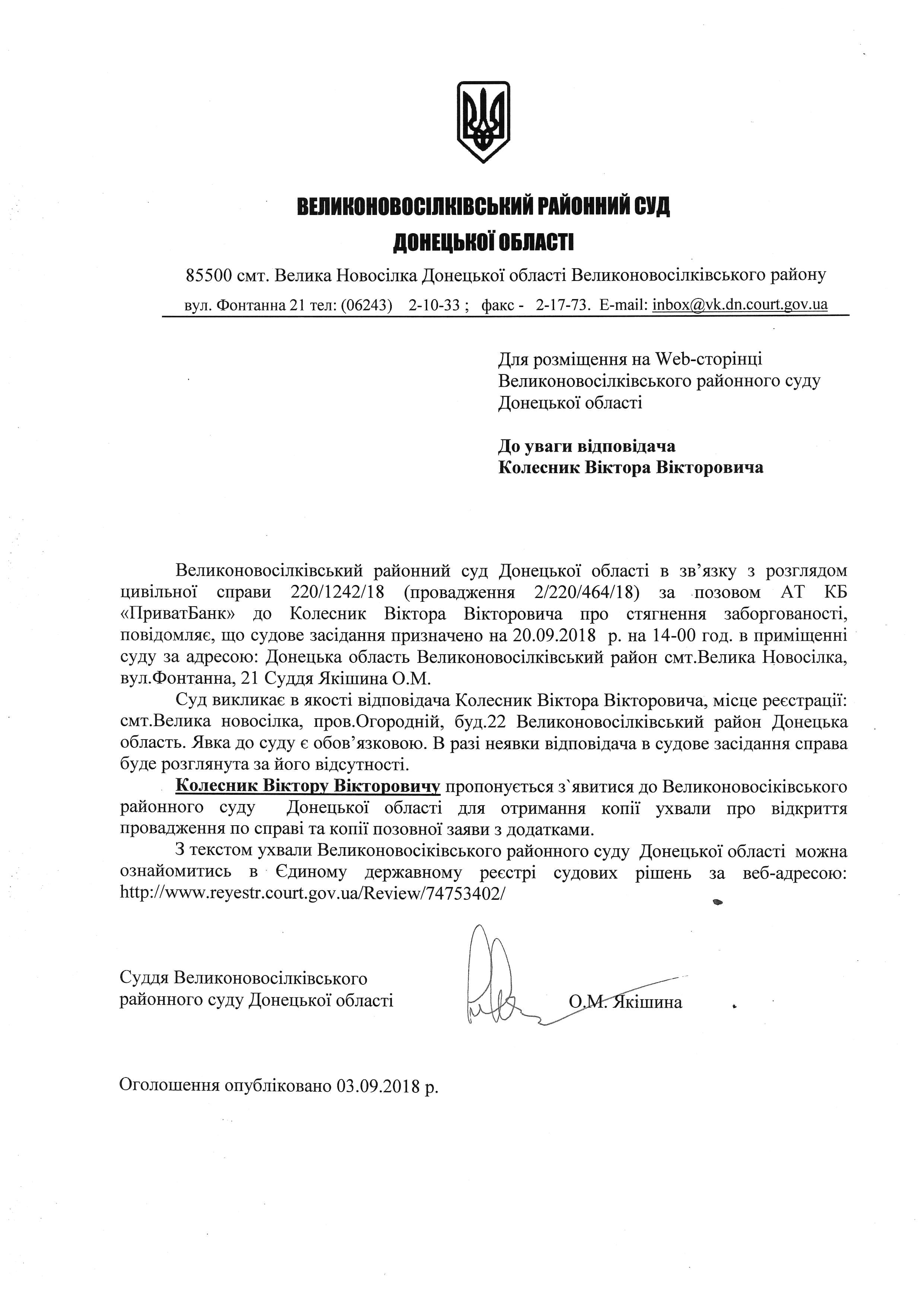 Оголошення про виклик до суду Колесник В.В.
