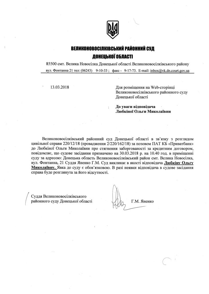Оголошення про виклик до суду Лобкіної О.М.