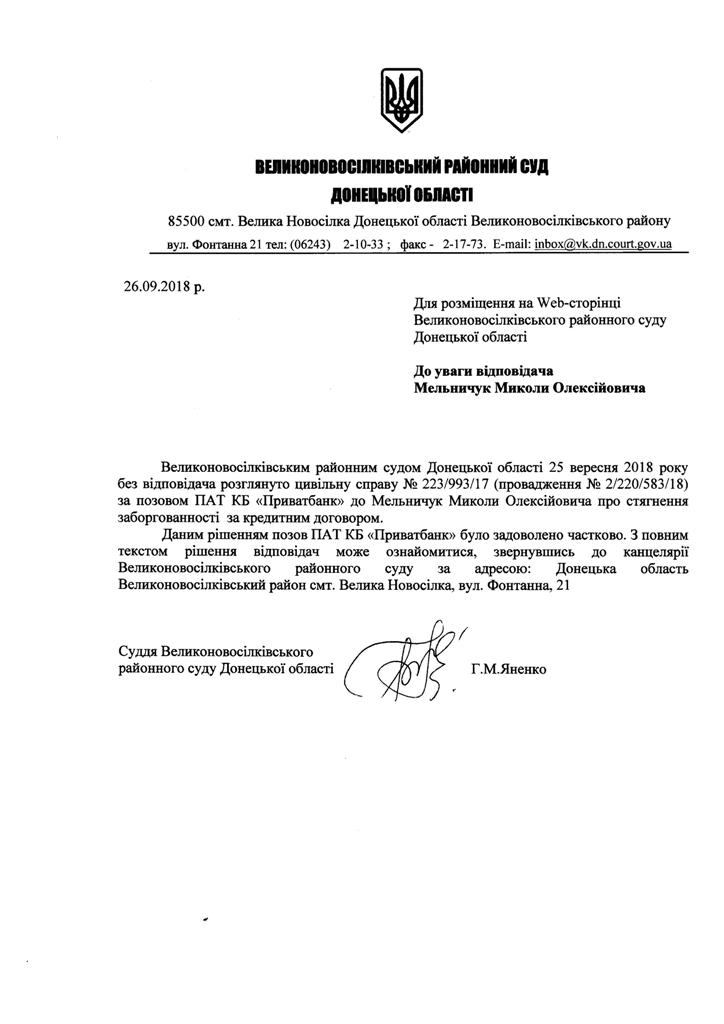 Оголошення для Мельничука М.О. щодо отримання копії рішення