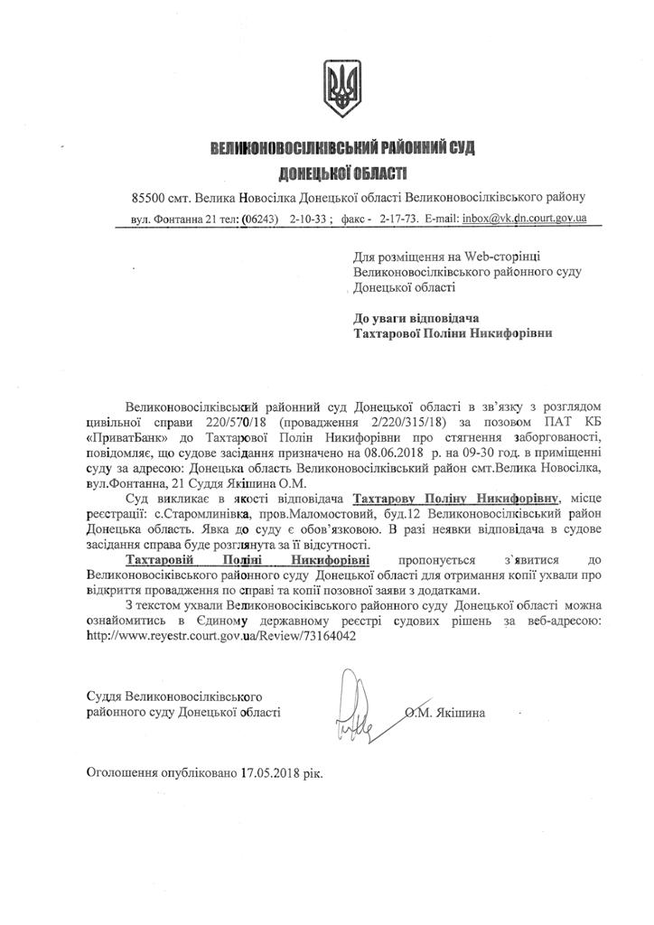 Оголошення про виклик до суду Тахтарової П.Н.