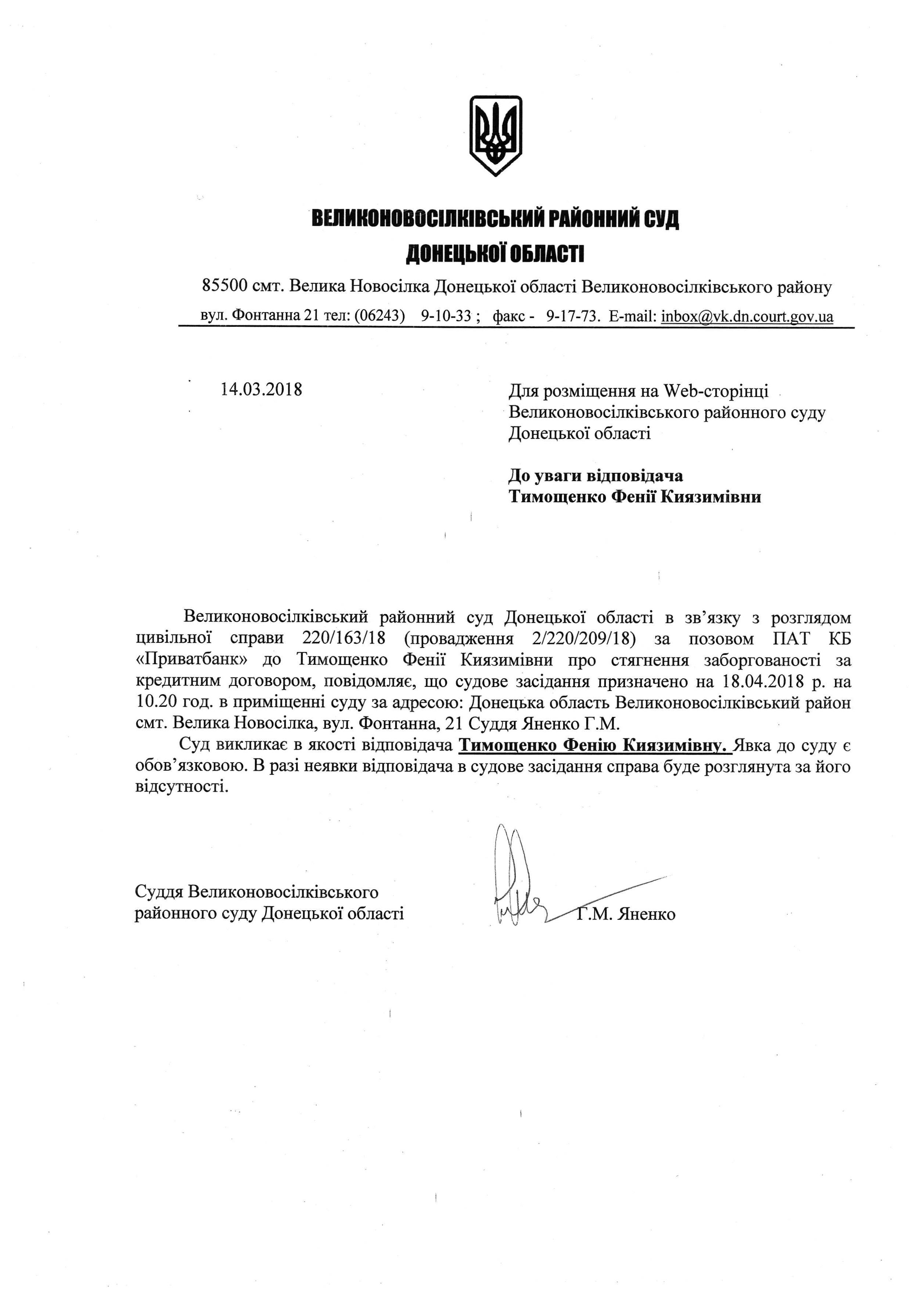 Оголошення про виклик до суду Тимощенко Ф.К.