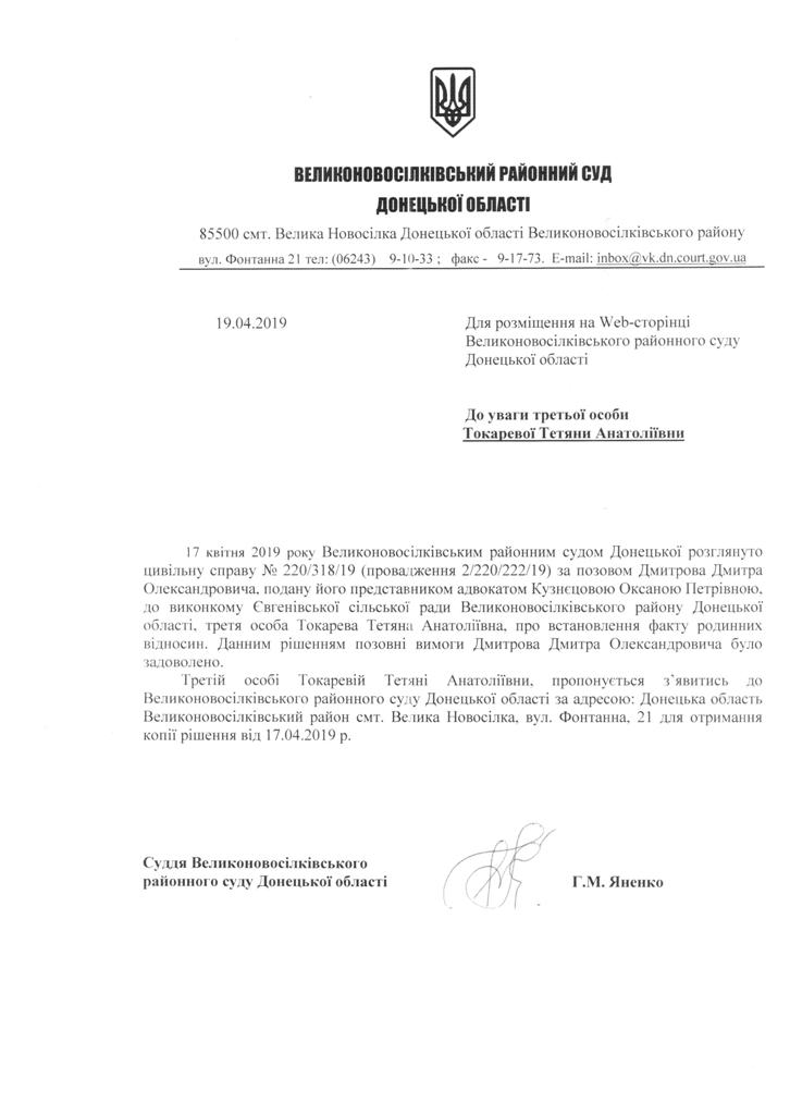 Оголошення для Токаревої Т.А. щодо отримання копії рішення