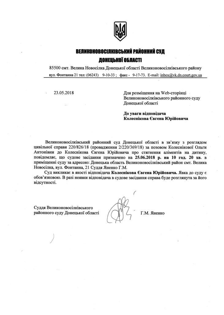 Оголошення про виклик до суду Колеснікова Є.Ю.