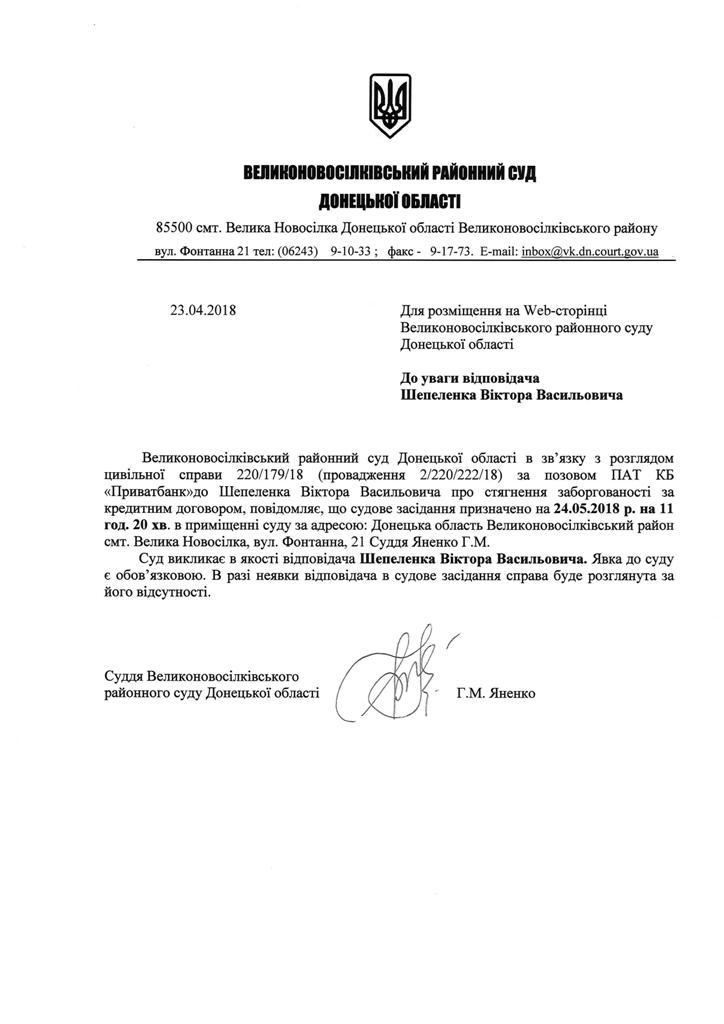 Оголошення про виклик до суду Шепеленко В.В.