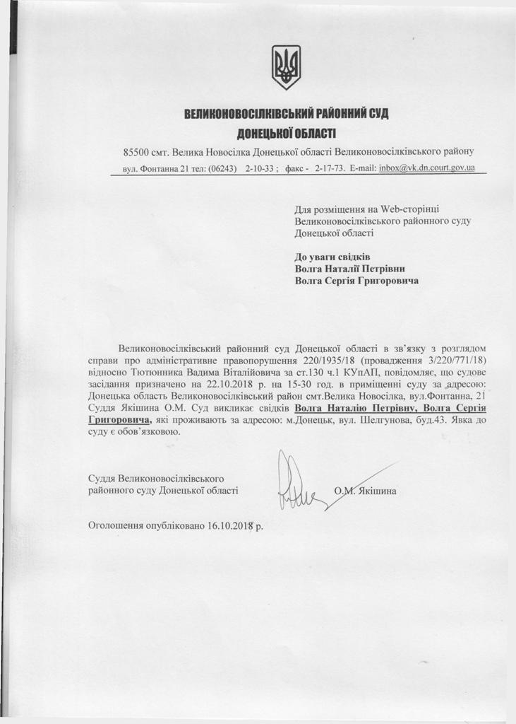 Оголошення про виклик до суду Волга Н.П.,Волга С.Г.