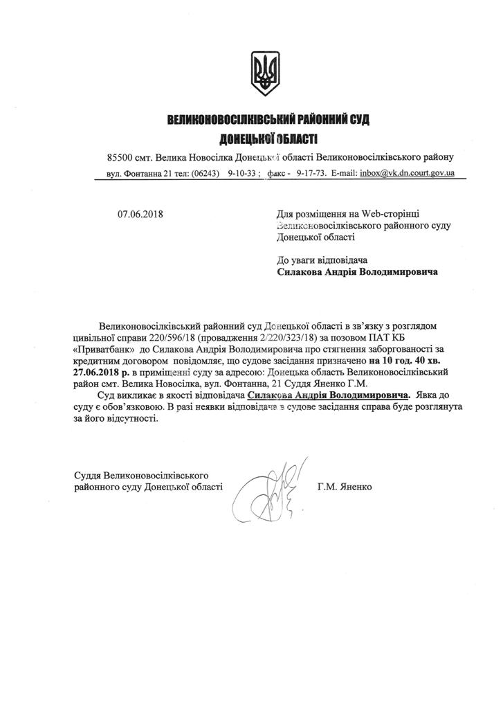 Оголошення про виклик до суду Силакова А.В.