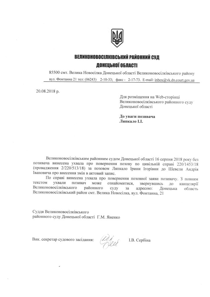 Оголошення про виклик до суду Ляпкало І.І.