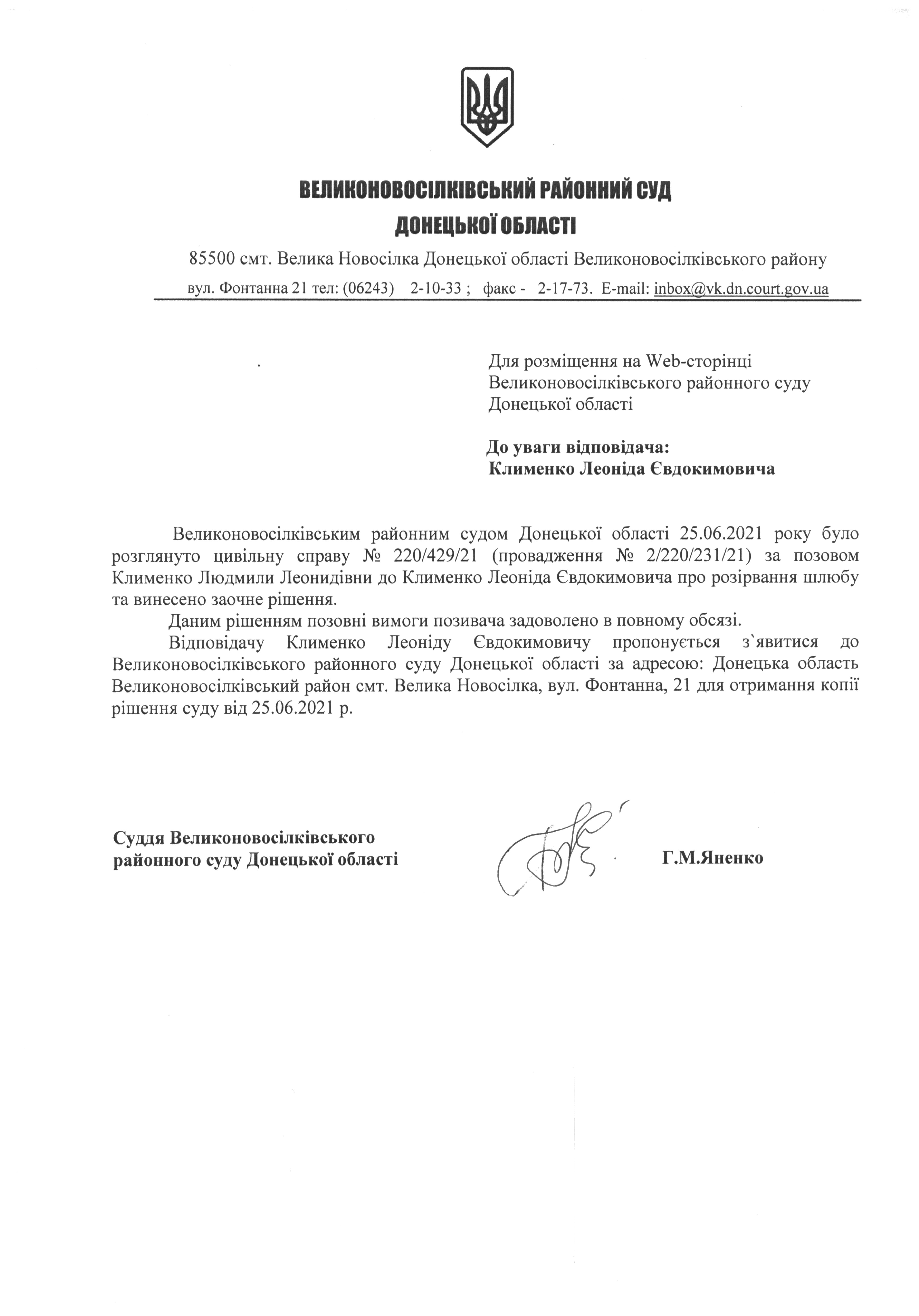 До уваги відповідача Клименко Леоніда Євдокимовича