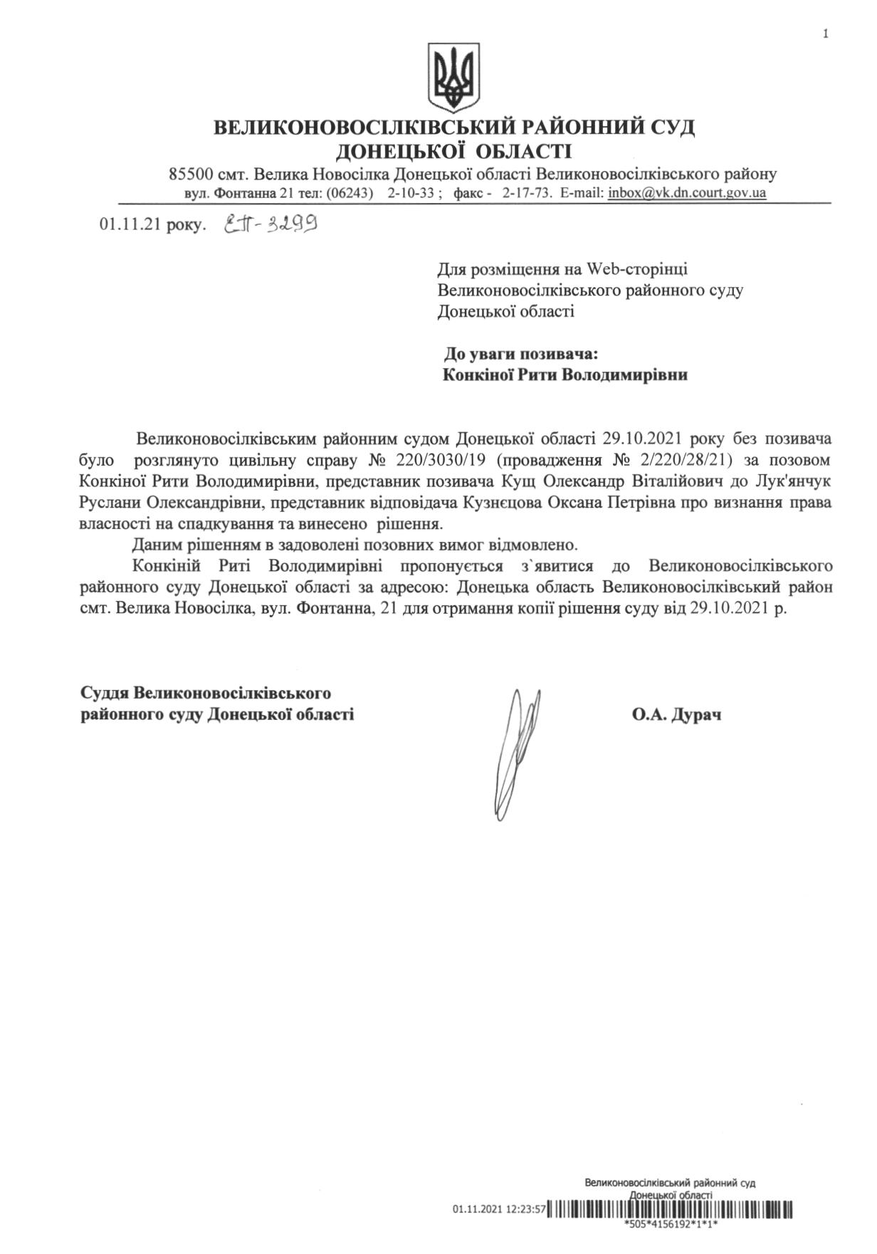 До уваги позивача Конкіної Рити Володимирівни