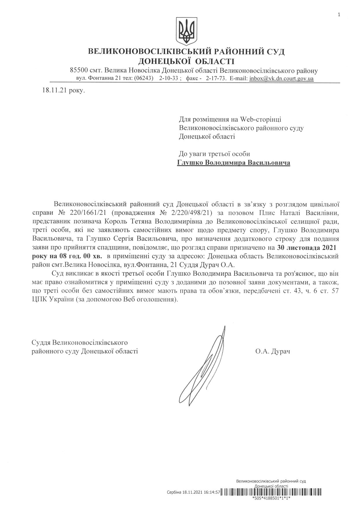 До уваги третьої особи Глушко Володимира Васильовича