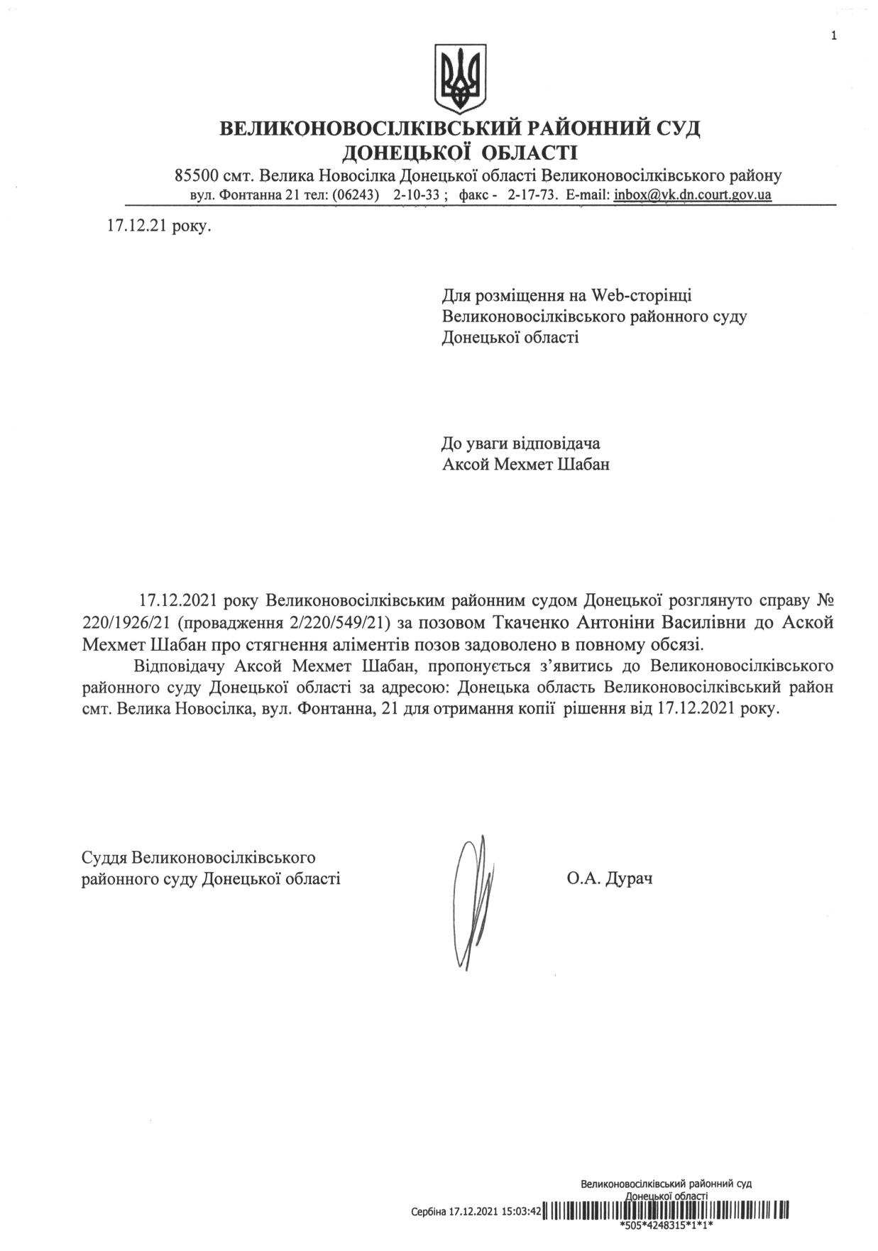 До уваги відповідача Аксой Махмет Шабан