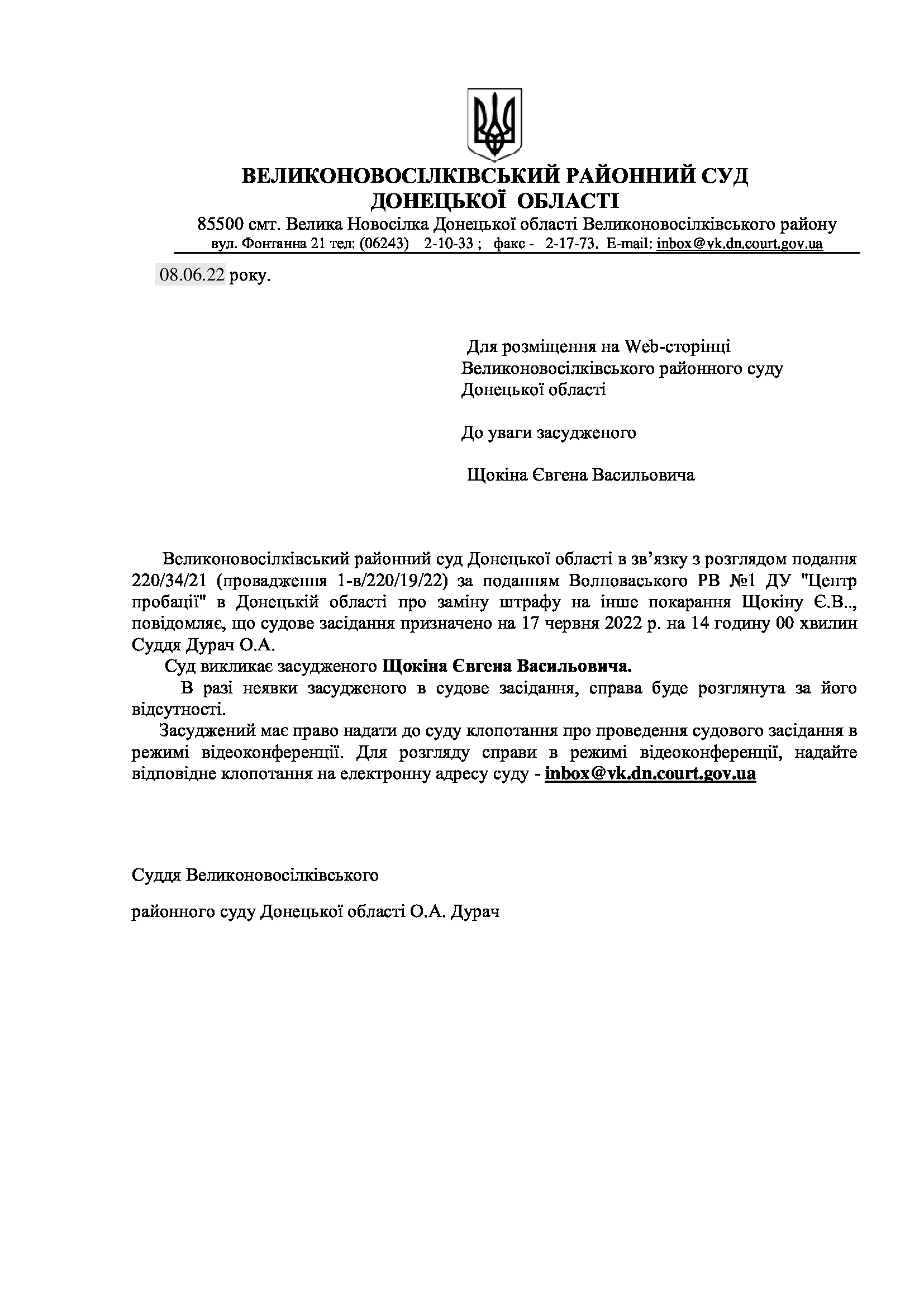 До уваги засудженого Щокіна Є.В.