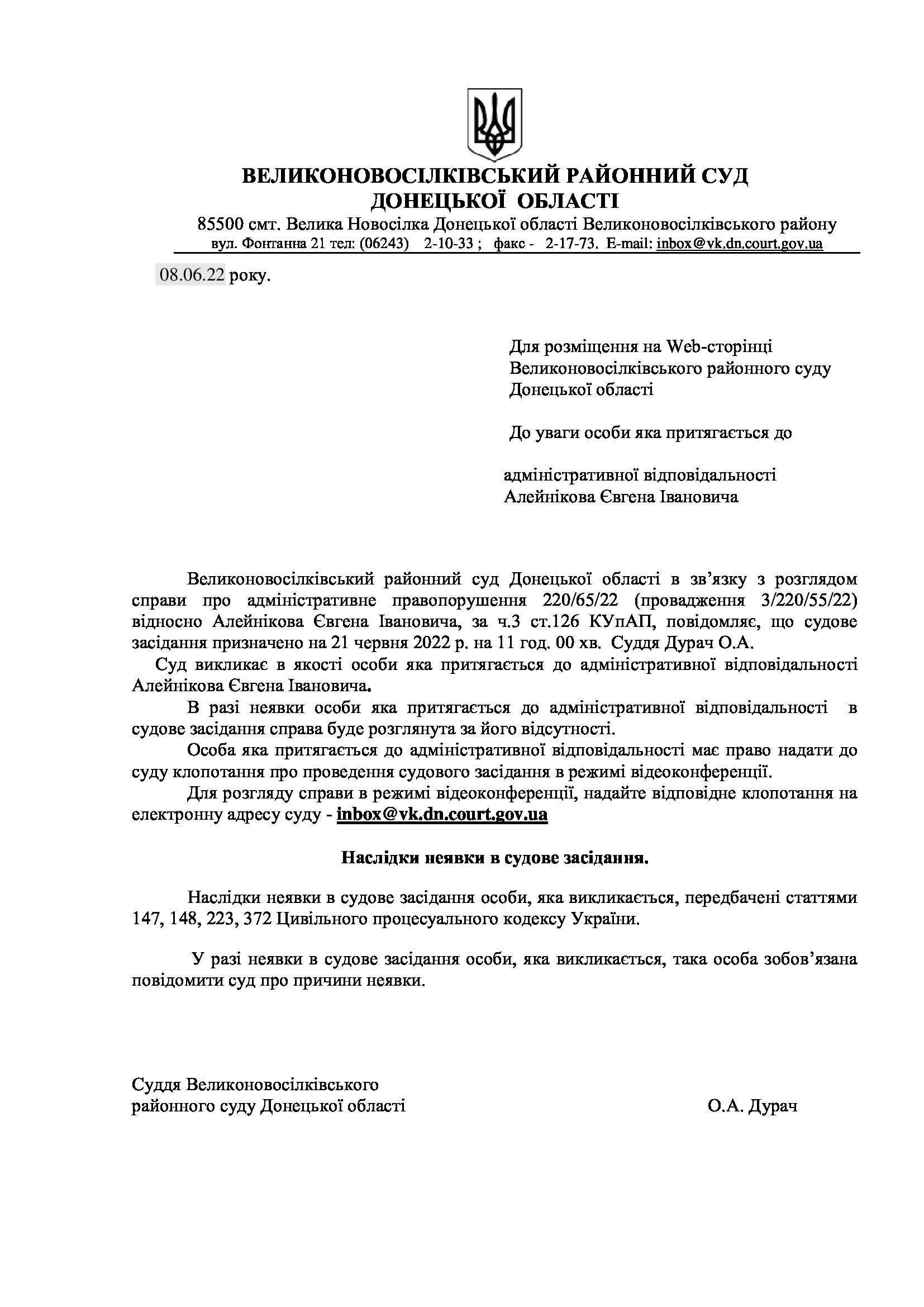 До уваги особи, яка притягається до адміністративної відповідальності Алейнікова Є.І.