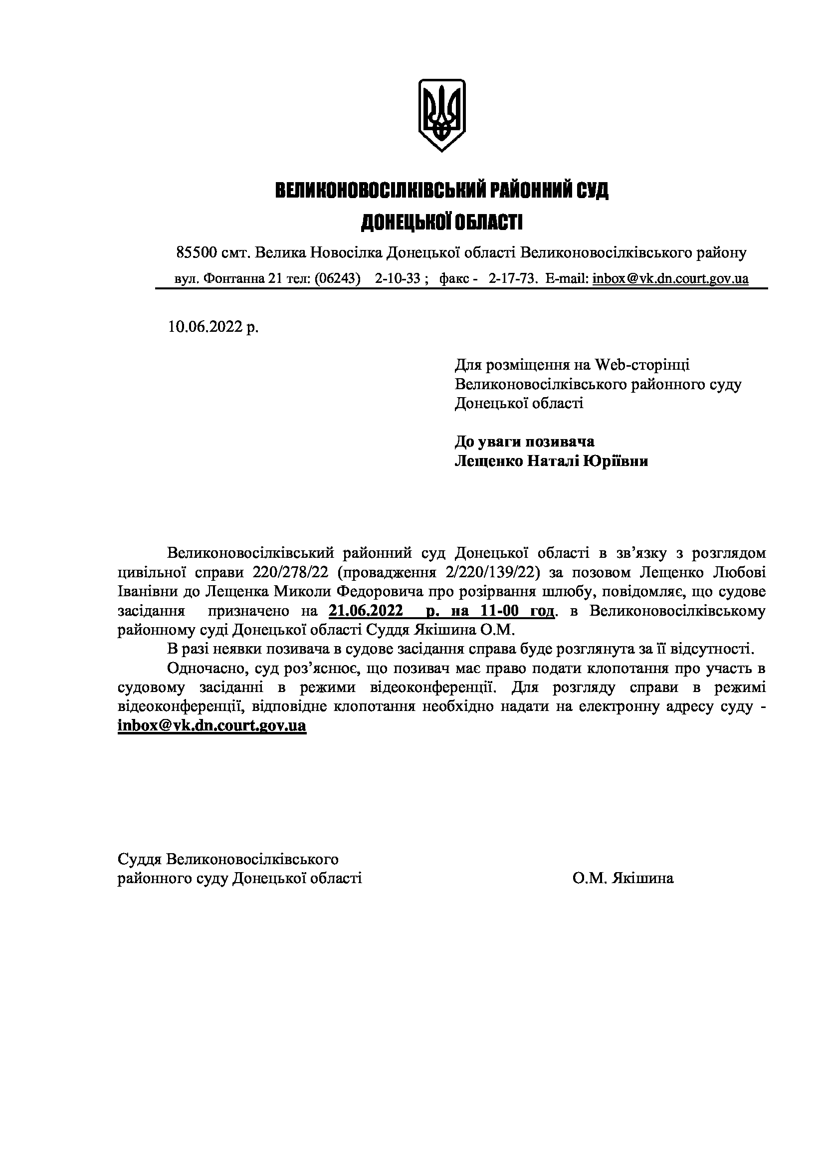 До уваги позивача Лещенко Н.Ю.