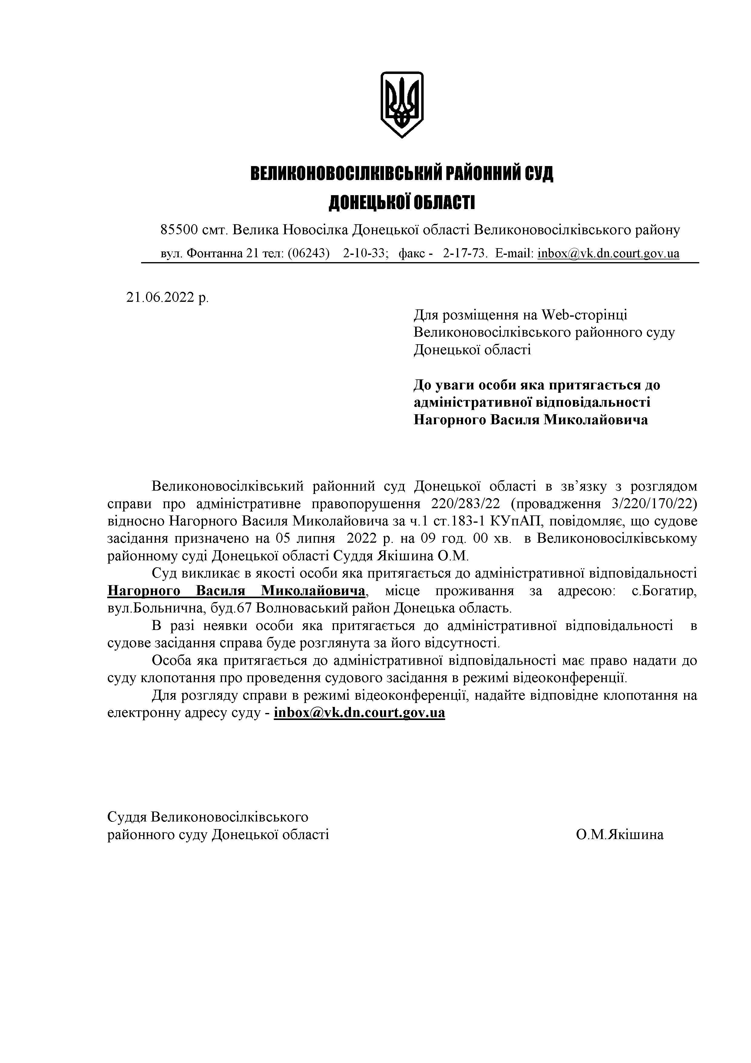До уваги особи, яка притягається до адміністративної відповідальності Нагорного В.М.