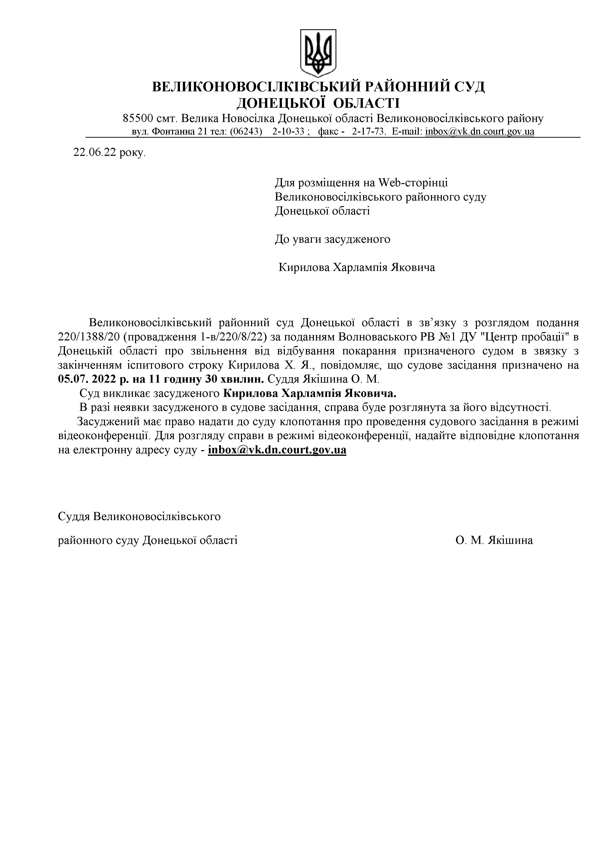 До уваги засудженого Кирилова Х.Я.