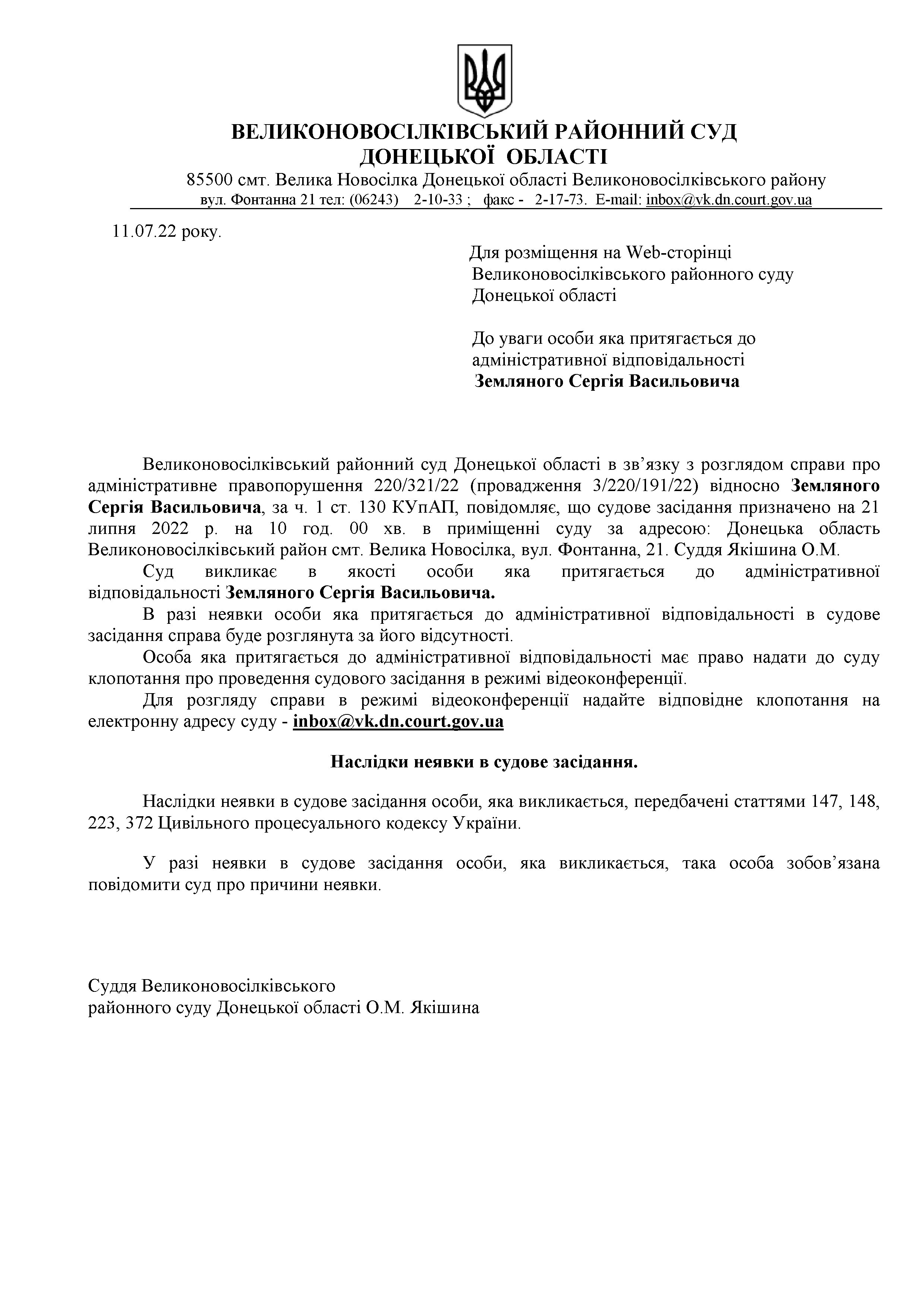 До уваги особи, яка притягається до адміністративної відповідальності Земляного С.В..