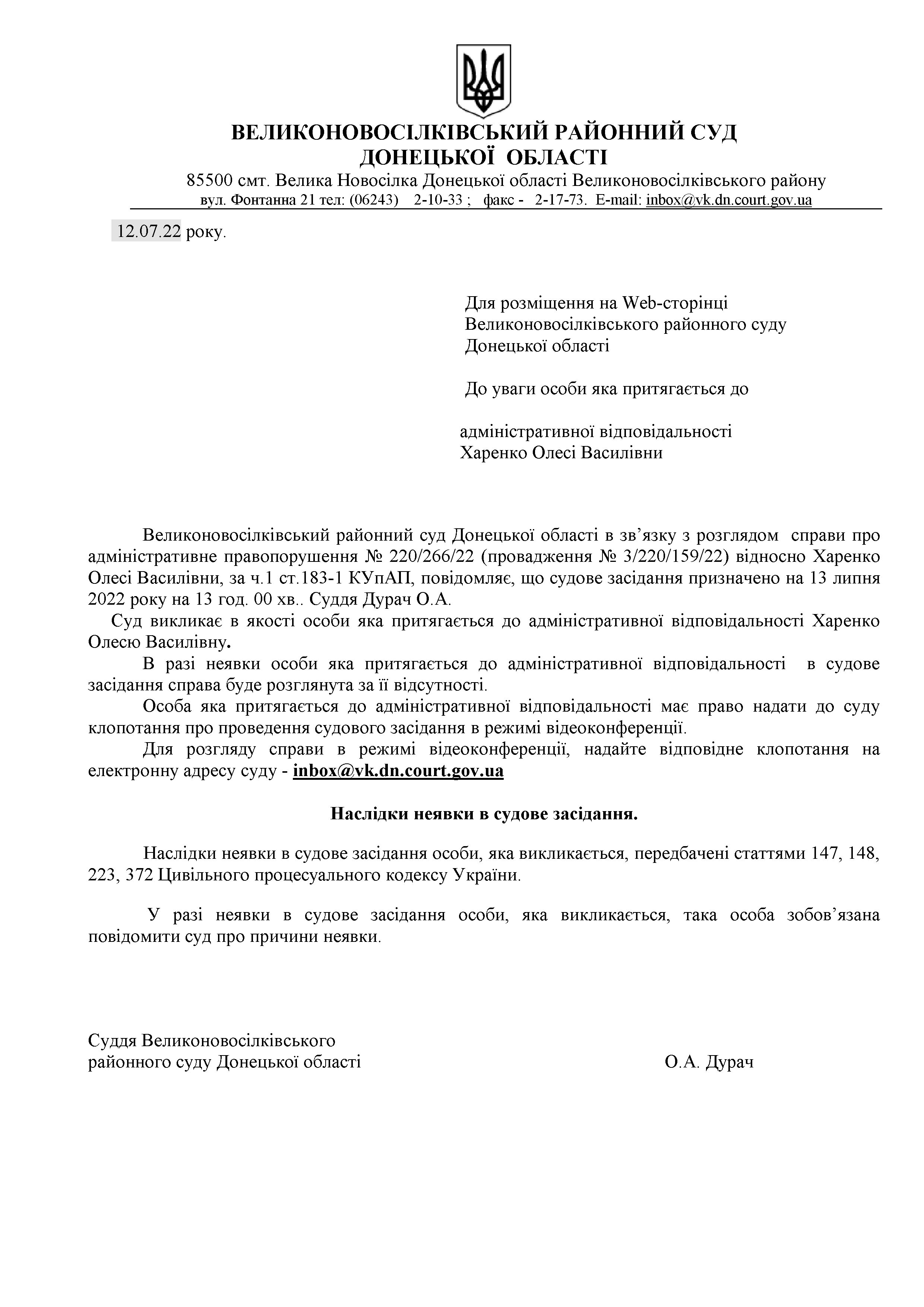 До уваги особи, яка притягається до адміністративної відповідальності Харенко О.В.