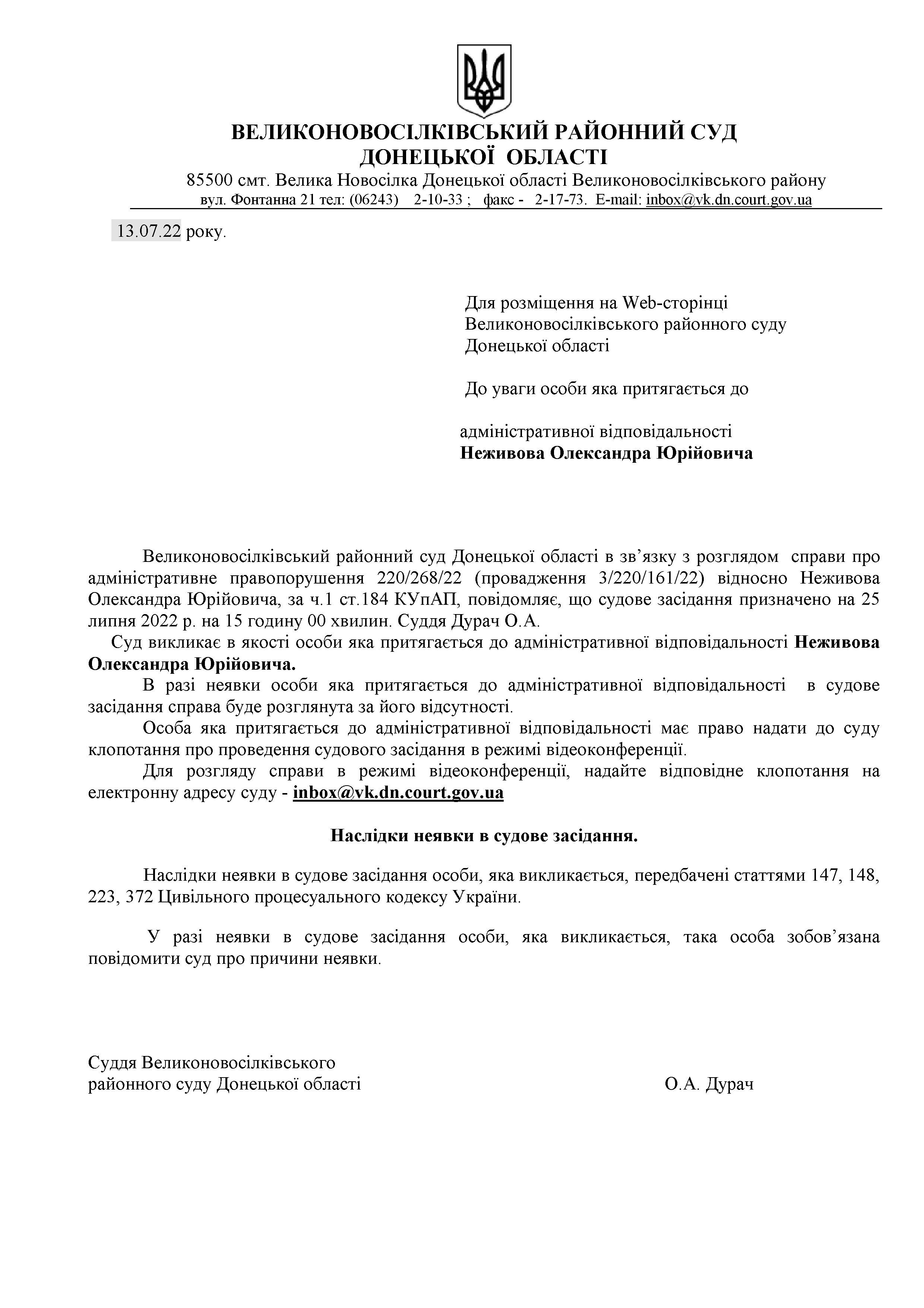 До уваги особи, яка притягається до адміністративної відповідальності Неживова О.Ю..
