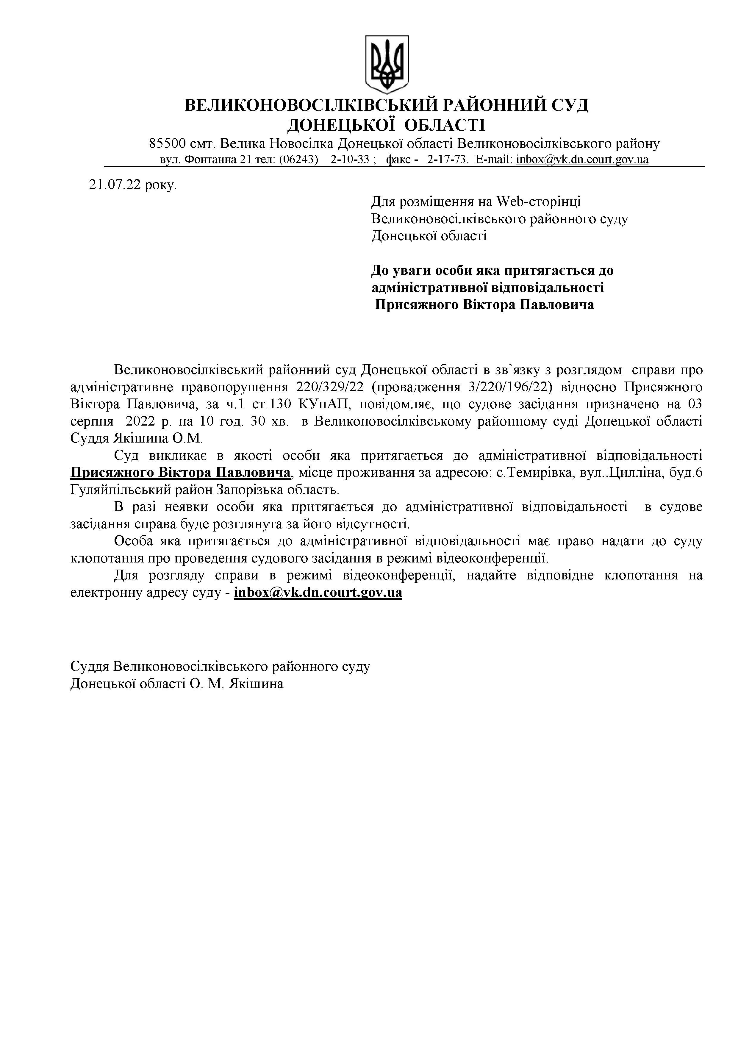 До уваги особи, яка притягається до адміністративної відповідальності Присяжного В.П.