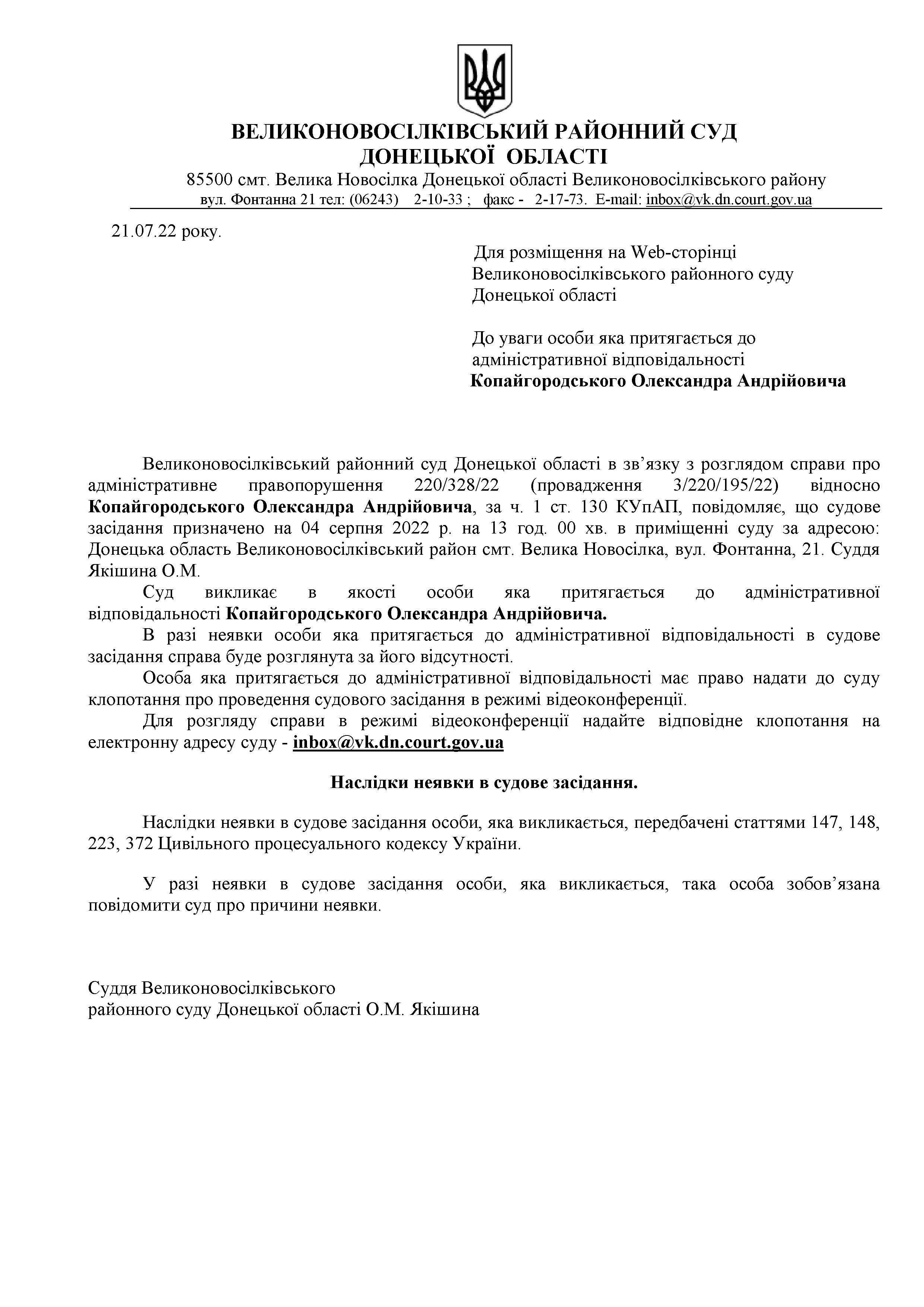 До уваги особи, яка притягається до адміністративної відповідальності Копайгородського О.А.