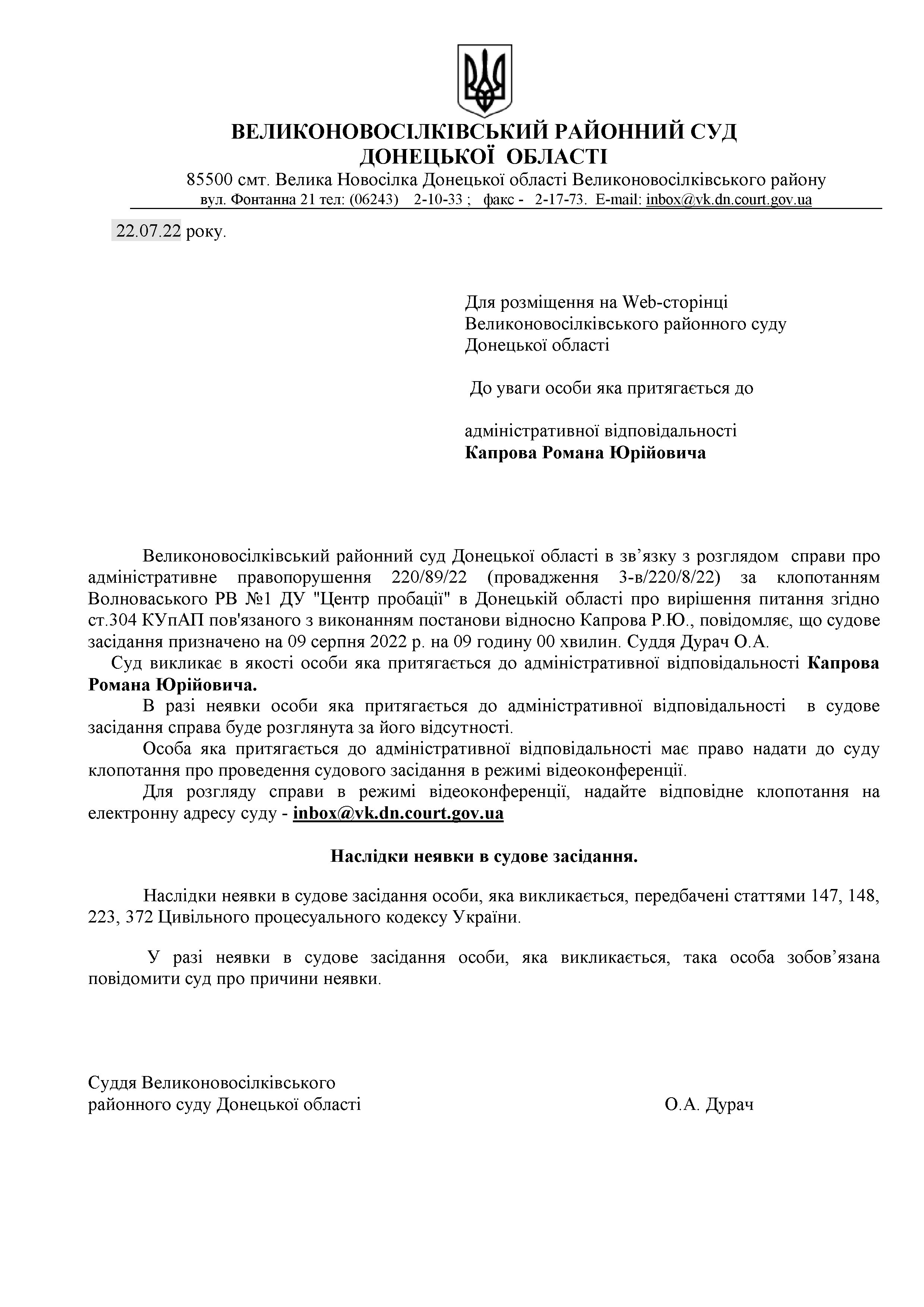 До уваги особи, яка притягається до адміністративної відповідальності Капрова Р.Ю.